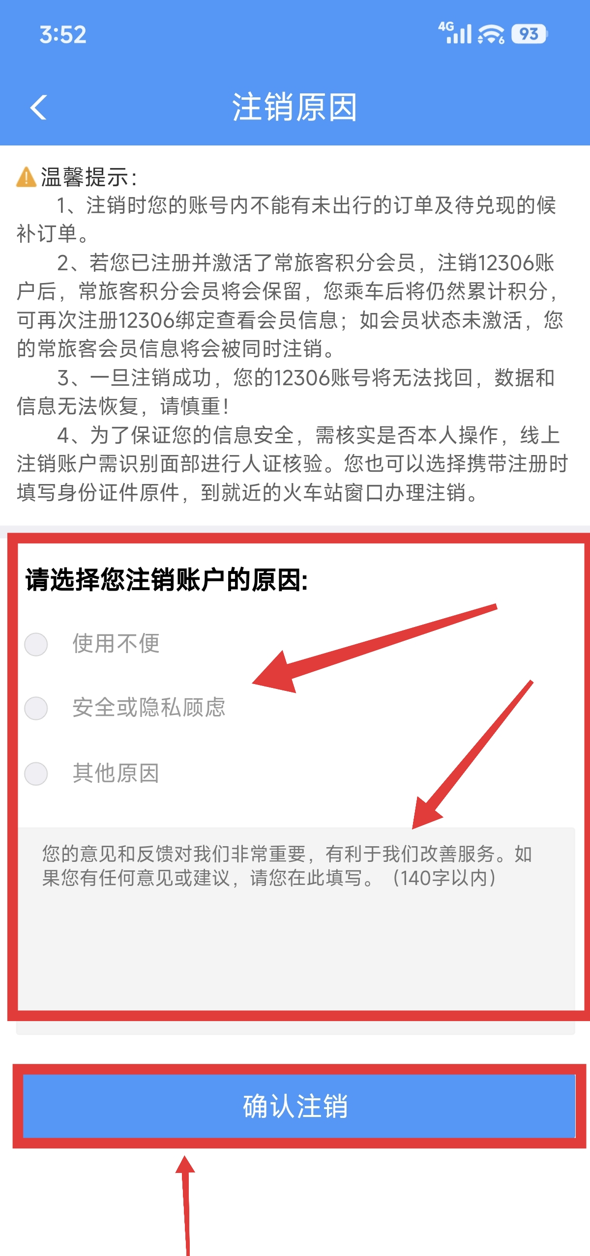3.进入到注销原因页面后,选择(注销原因)输入(意见和反馈),然后点击(确认注销)按钮即可了。