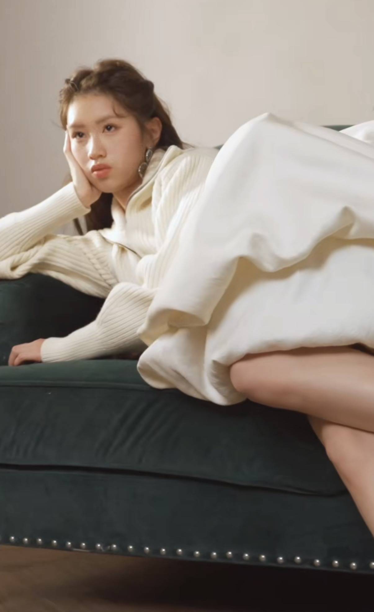 徐朵这次的造型很少女,是那种清纯中带一点甜的感觉。她穿半高领的白色毛衣,发型做成了公主半扎发,温婉甜美,若隐若现的双腿更显轻盈。
