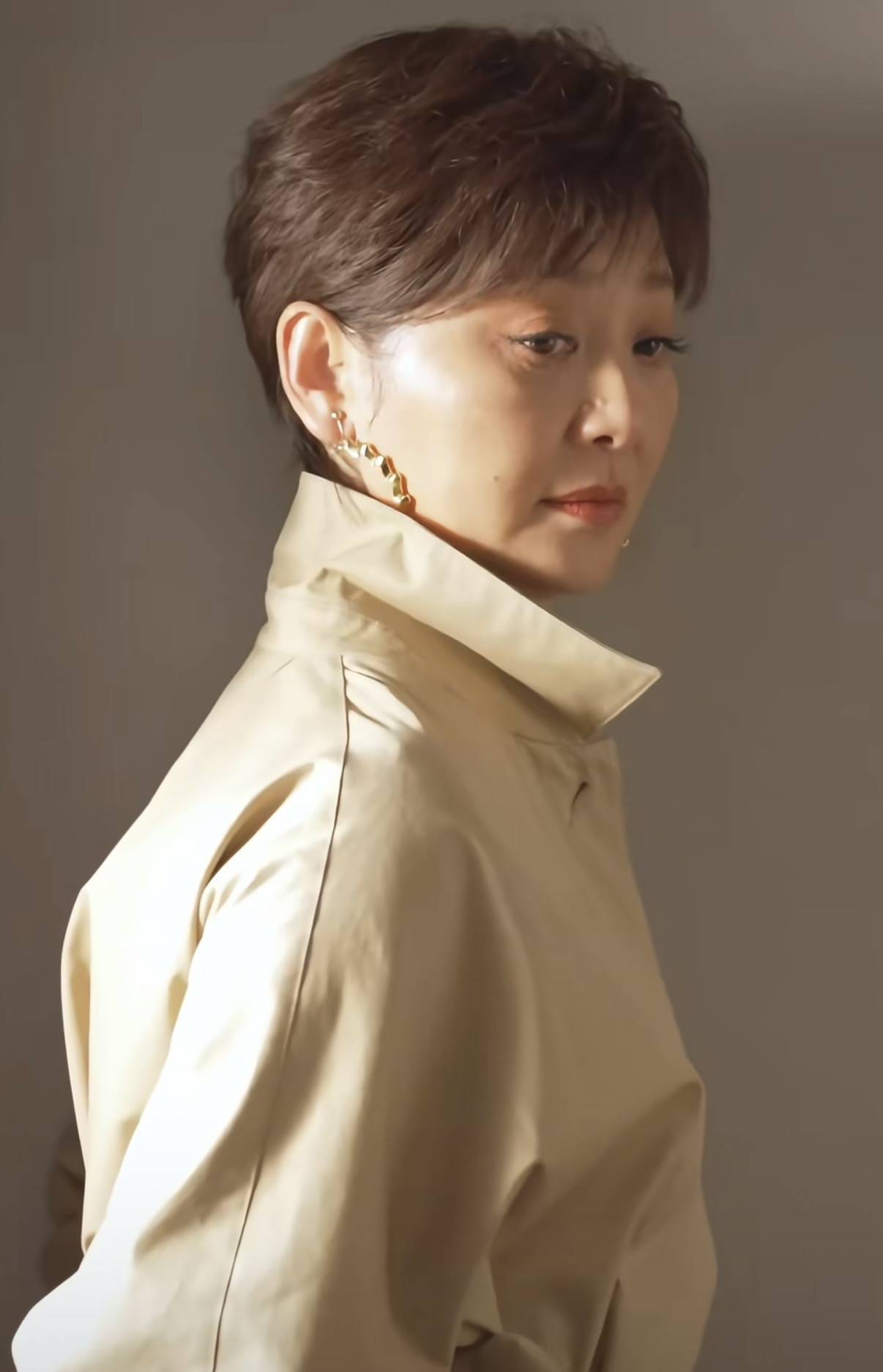 一头利落的短发,化着精致的端庄,要说唯一惹眼的就耳边的那对耳环了。这样的徐帆,低调、干练、特别大方。