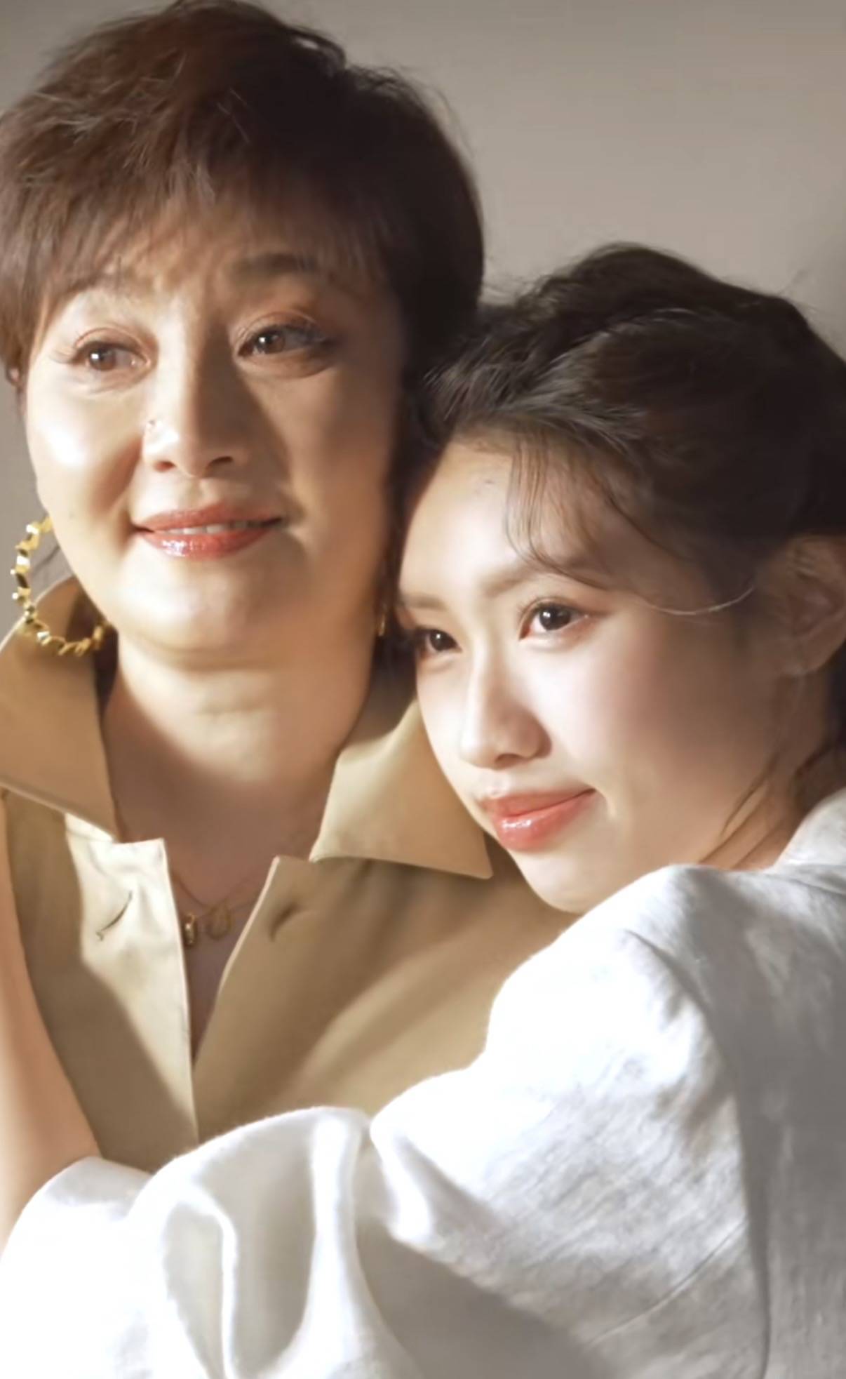 徐朵像个小朋友一样,去轻轻触碰妈妈的耳环,只有感情亲密的人,才会不自觉的做出这样的小动作。