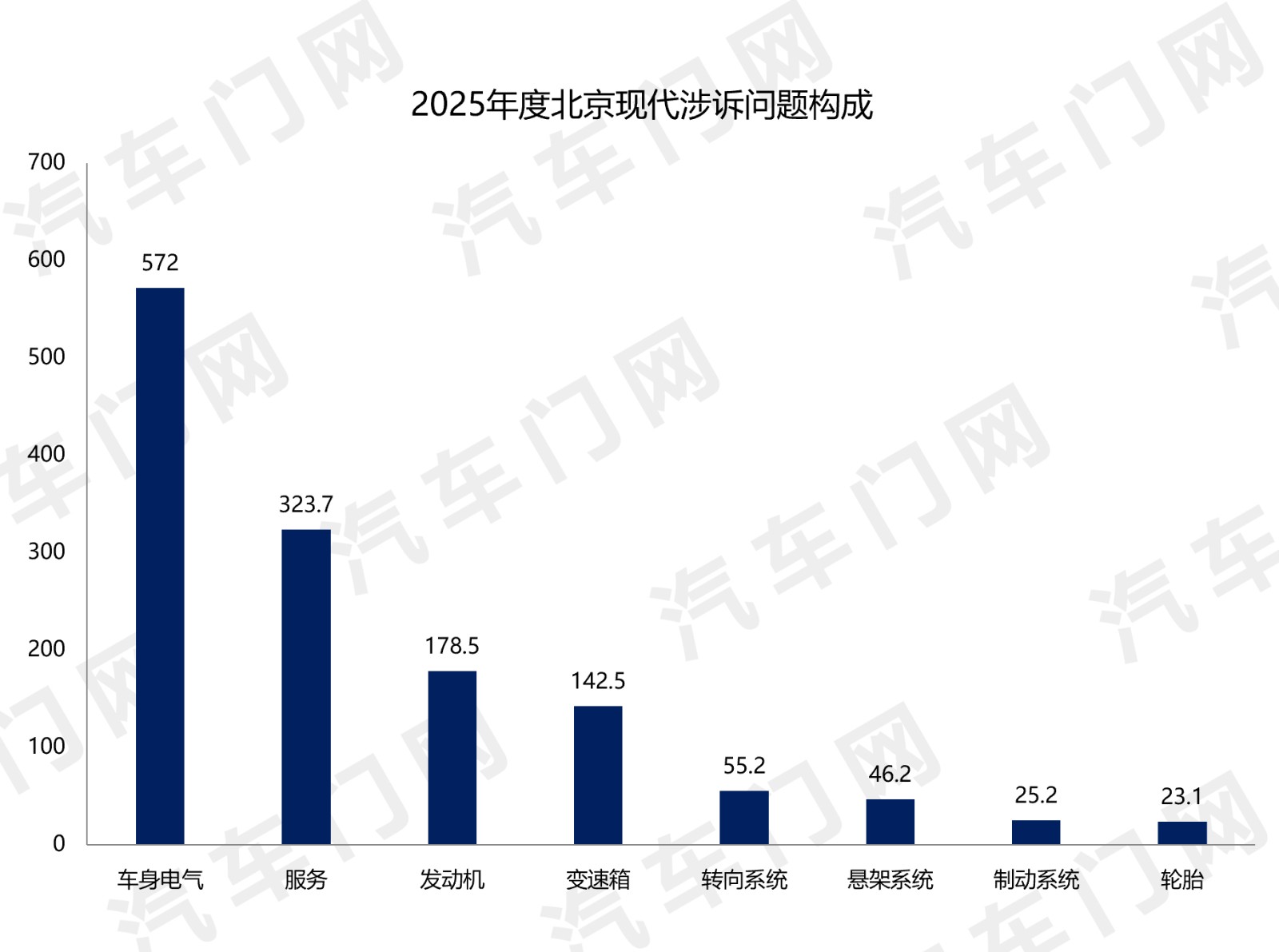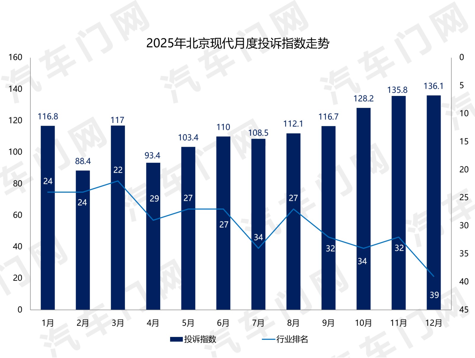 来自汽车门网的数据显示:2025年,北京现代的投诉指数达到了1366.4,同比下滑了10%,位于车企年度投诉榜单第33名。