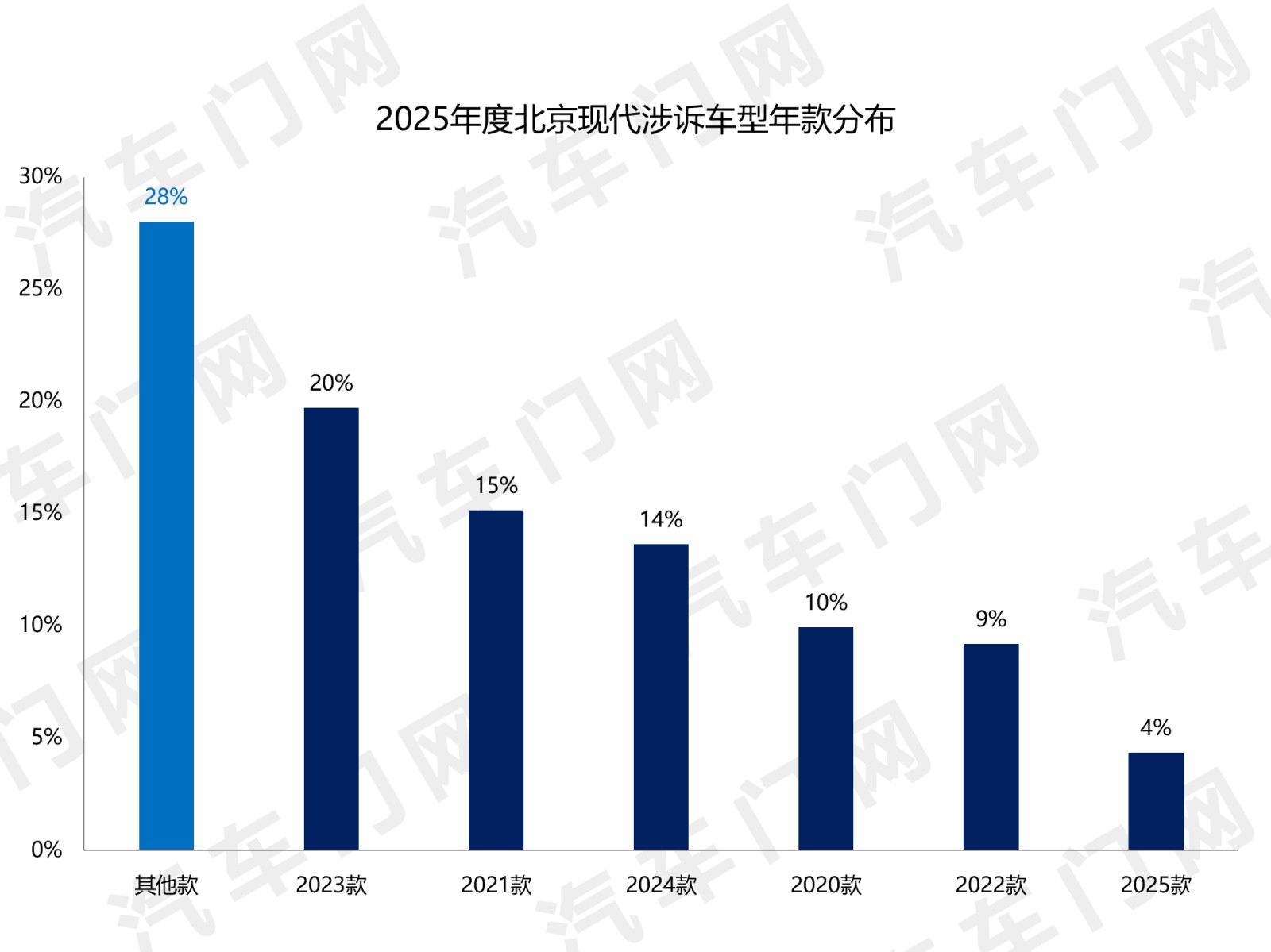 而从涉诉车型的年款来看,六年以上的老款车型投诉指数达到了382.5,占到了北京现代整体投诉指数的28%。2023款、2021款、2024款车型的投诉量也处于相对高位,合计投诉占比49%。由于2025款是新车型,保有量偏低,因此投诉量也不多。