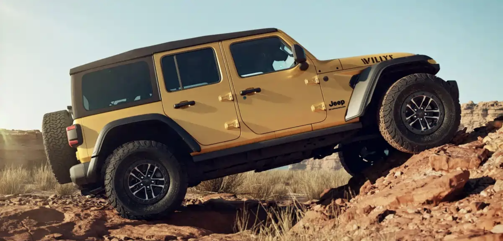来到车身侧面,Jeep牧马人Willys 392采用了特殊的沙漠黄车漆涂装,随处可见的黑色Jeep浮雕,凸显出了该车特殊身份。车身采用了大量横平竖直的线条勾勒,保持了传统的四门机械车门结构,并带有手动可拆卸的顶棚。外扩式的黑色挡泥板搭配着黑色的宽体迎宾踏板。呈现出宽体方盒子越野车的姿态。配备了17英寸的防脱圈以及35英寸的百路驰KO2越野轮胎,规格为285/70 R17、245/75 R17。通过性方面,这台车的接近角43.9°-44.5°,离去角37°-37.5°,通过角23°,最小离地间隙282mm,加装高位进气管后可超900mm。尺寸方面,Jeep牧马人Willys 392的长宽高分别为4882*1894*1848mm,轴距3008mm,是一款四门版车型。