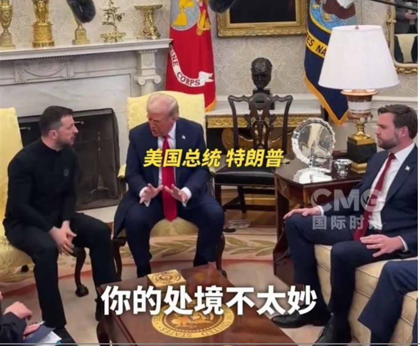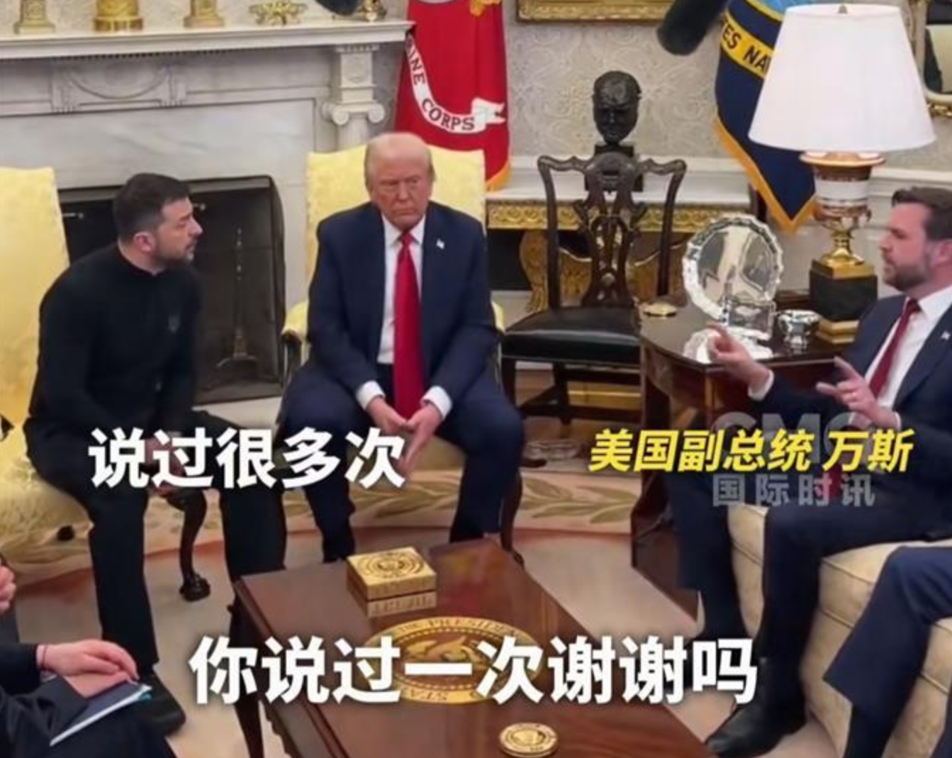 40分钟后,气氛彻底紧张起来。副总统万斯插话,建议泽连斯基考虑用外交手段解决问题。泽连斯基却立刻反驳,列举了一系列历史事件,强调外交努力的无效性。万斯不甘示弱,指责泽连斯基不尊重人。两人之间的肢体动作逐渐对立,争吵一触即发。万斯提到泽连斯基人手不足,需要感谢美国的支持,泽连斯基则反问:“你去过乌克兰前线吗?”万斯没有回应,只是声称自己全面观察了事件。泽连斯基听后,叹了口气,小声嘀咕了一句脏话。至此,三人之间的争吵彻底爆发。