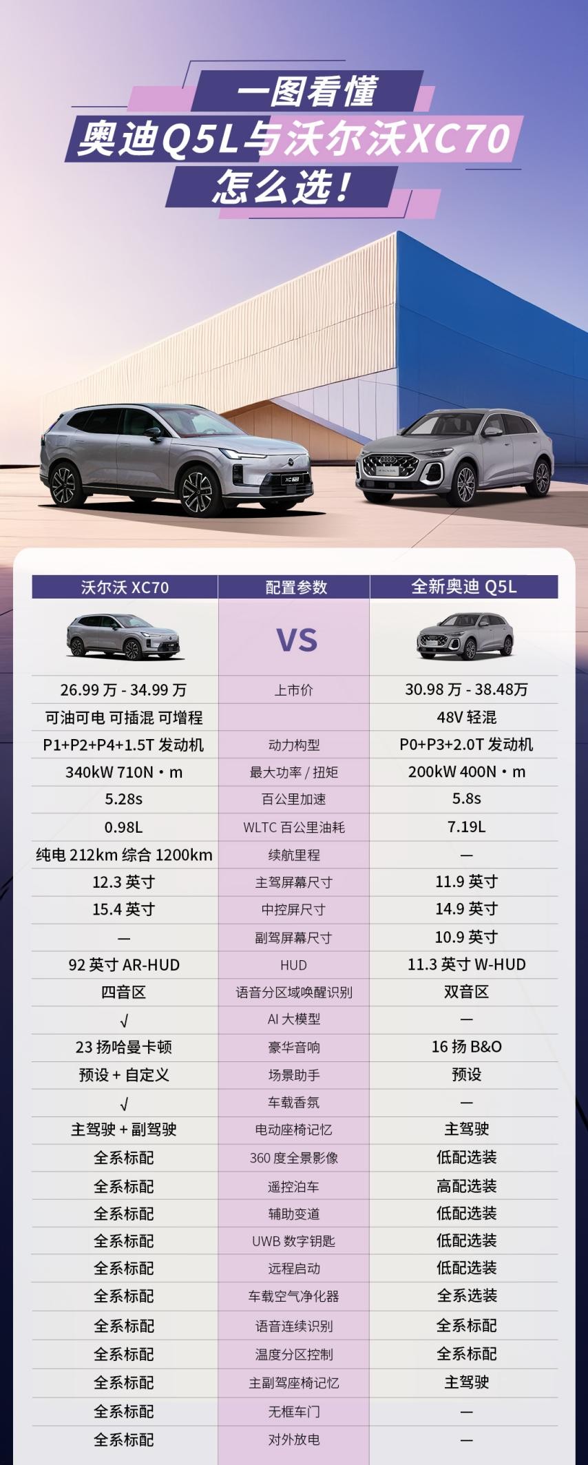 对一些精英家庭来说,一款实用又有内涵的豪华车,带来的价值远比我们想象得多,这点我能理解,因为一款好的豪华车,它既能满足日常出行的需求,还能提供情绪价值。跟我高中同窗三年干金融的一位伙伴,前几天问我手握三十来万的预算,选全新奥迪Q5L入门款还是沃尔沃全新XC70顶配,说实话,这两款车都是比较靠谱的豪华SUV,但毕竟钱不是大风刮来的,总得二选一,或许其他车友也有相同的问题,那不妨我们一起来看看这两款车到底如何?
