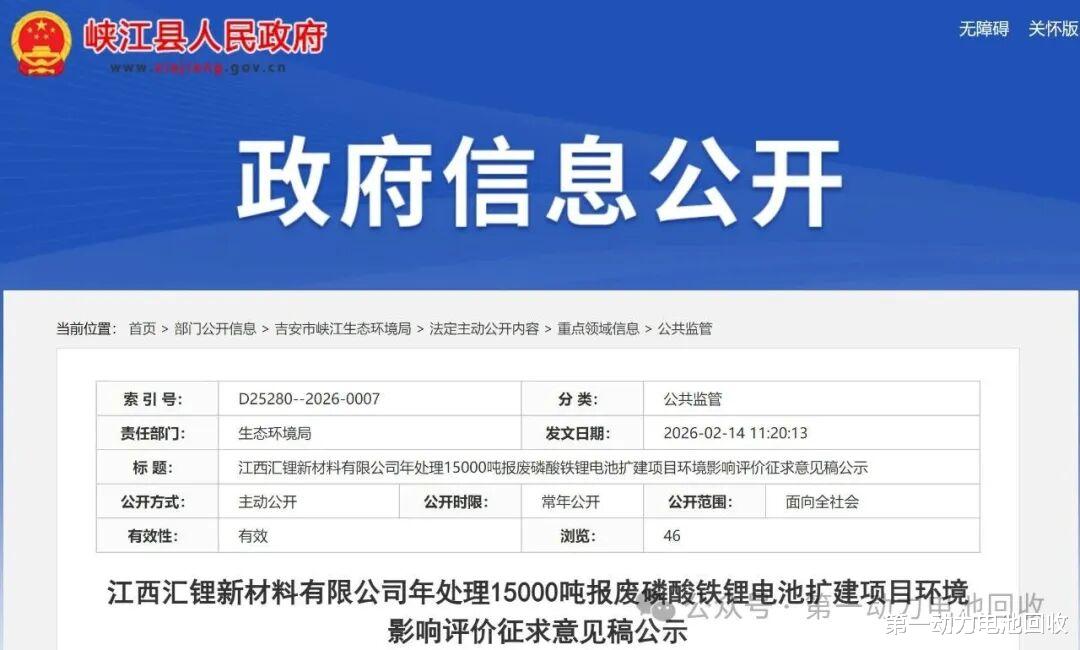第一动力电池回收消息,近日,江西省吉安市峡江县人民政府官网公布了《江西汇锂新材料有限公司年处理15000吨报废磷酸铁锂电池扩建项目》环境影响评价征求意见稿公示。