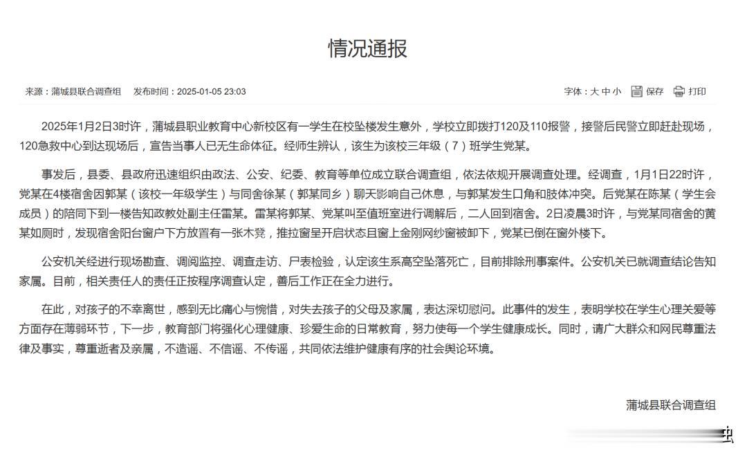比如2025年1月,陕西省渭南市蒲城县职业教育中心,就发生了一起坠楼事件。