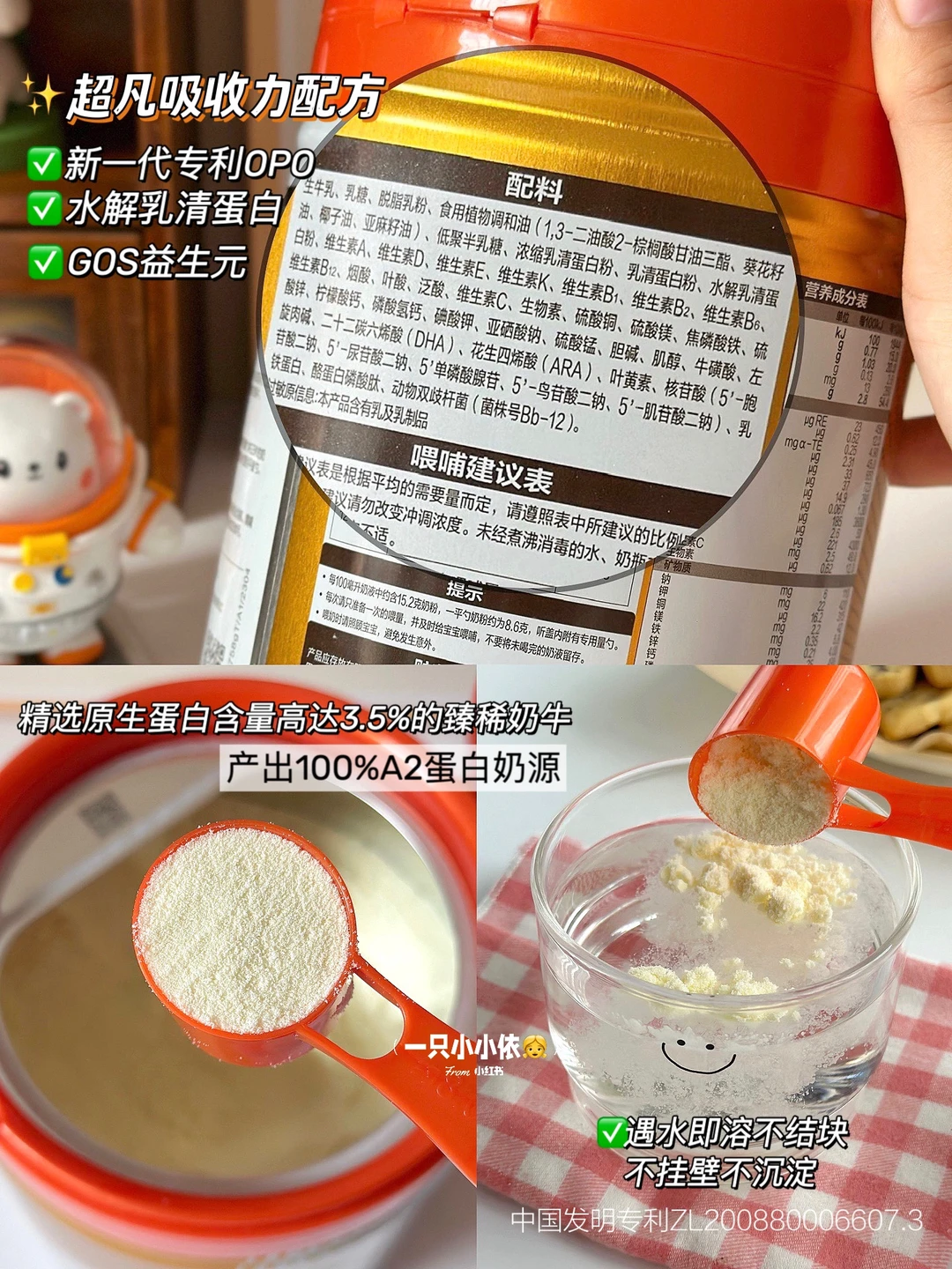 吸收配方上还有新一代专利OPO,促进脂肪和钙的吸收,以及小分子蛋白水解乳清蛋白和GOS益生元,可以帮助宝宝更充分的吸收营养~