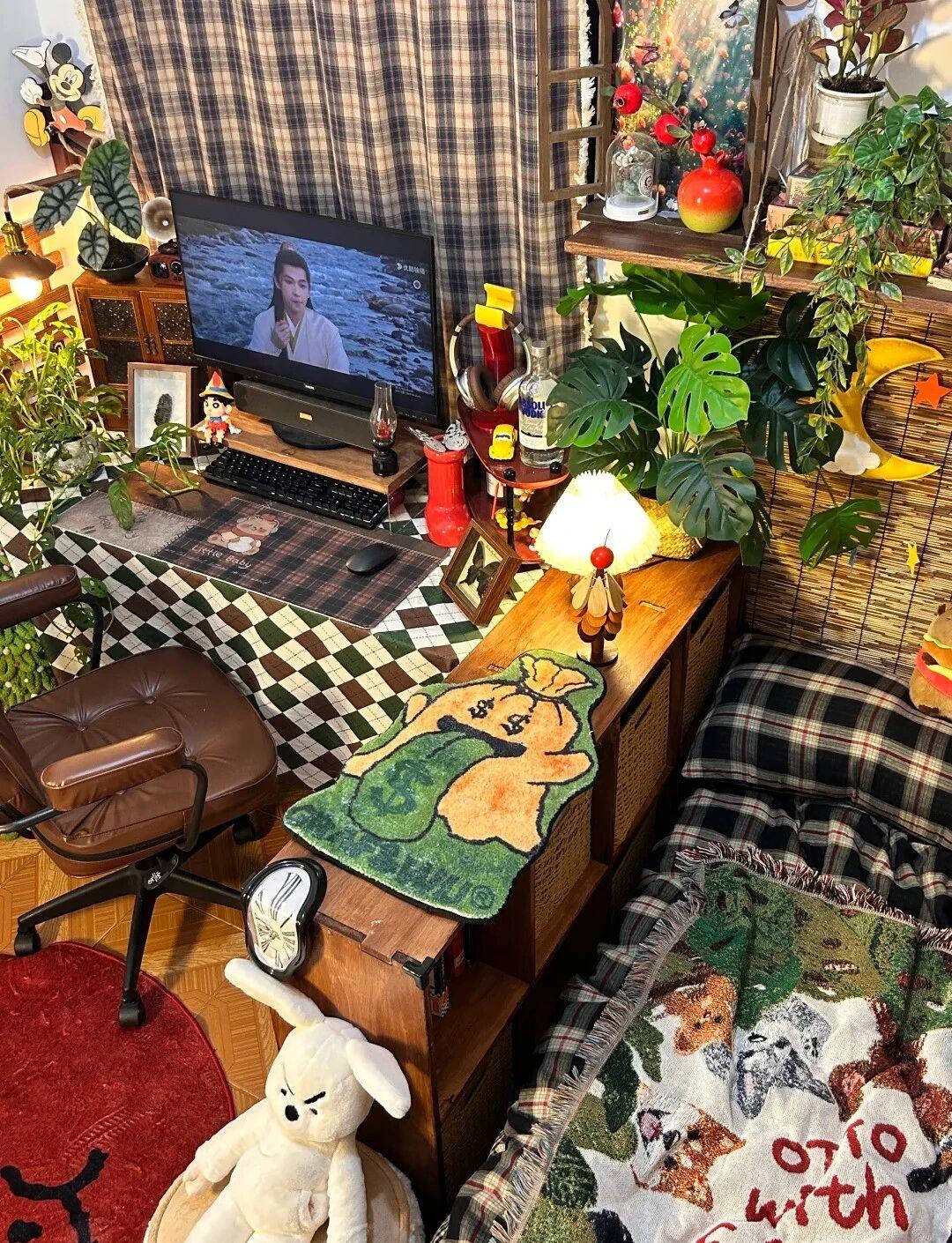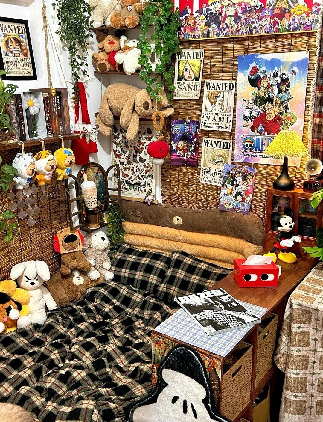 卧室也是如此,虽然空间不大,却摆满了超级多玩偶和装饰,墙壁上挂着《海贼王》海报、史努比装饰画,旁边的办公桌,铺上一张方格桌布,上方也选择了格纹窗户,还编织了蝴蝶串饰,灵动俏皮;