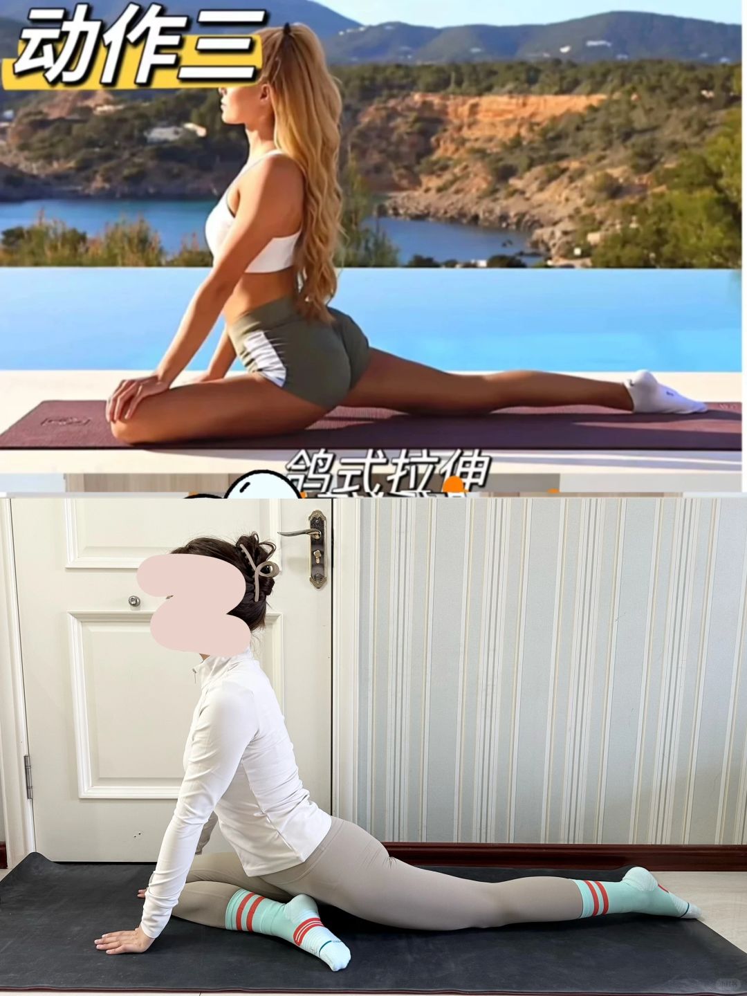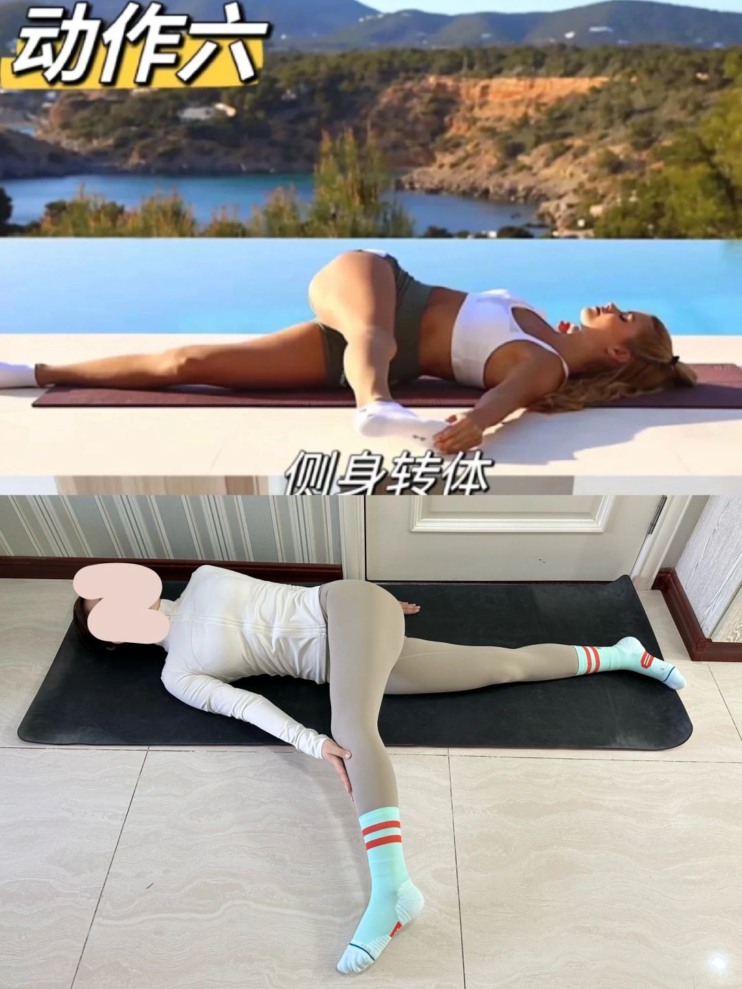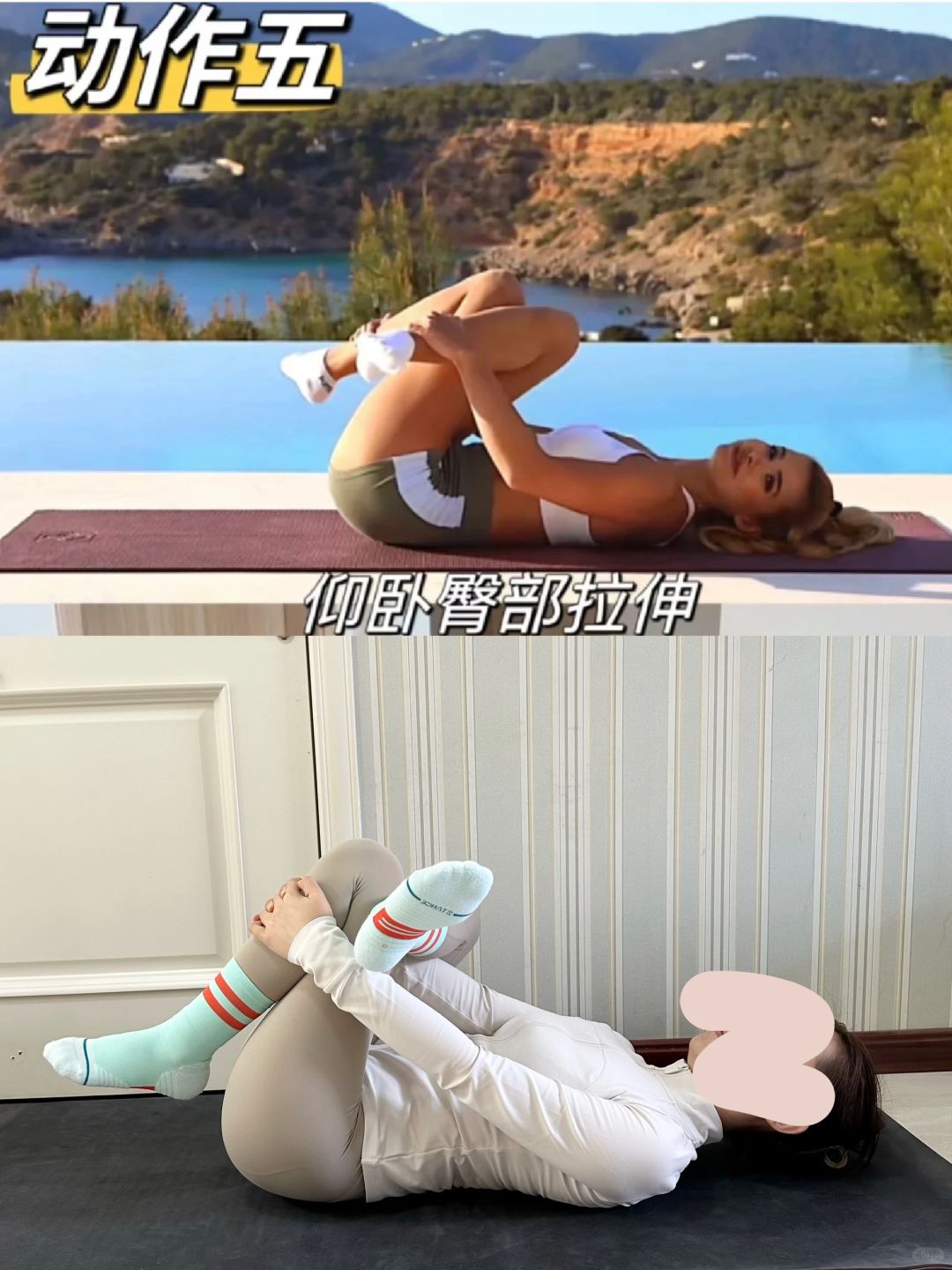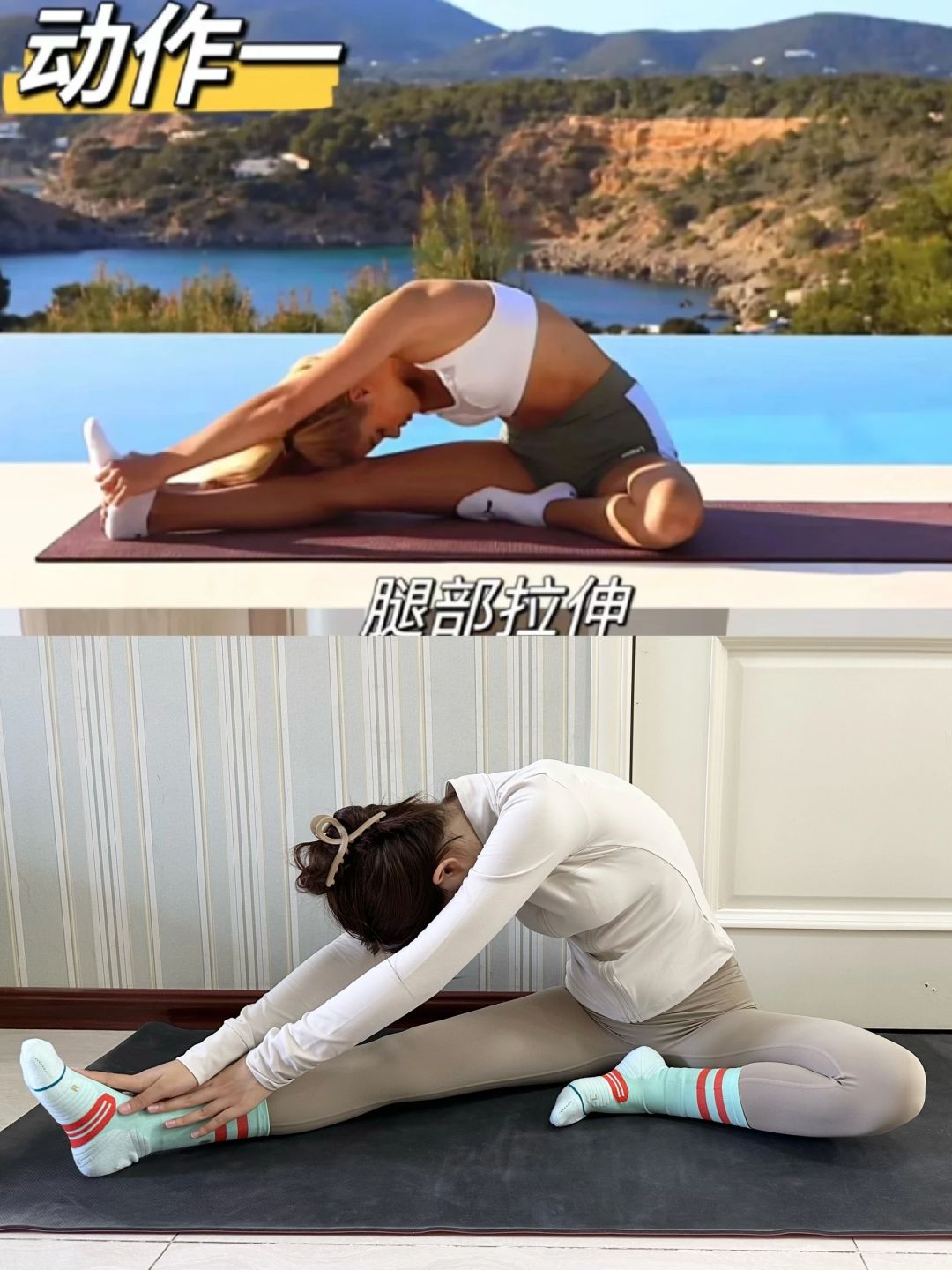 姐妹们!每天拉伸真的有惊喜!我愿称帕姐为永远的神! 松解大小腿肌肉,臀线也越来越明显了! 尤其是平时没空运动的姐妹,一定要试试! 找个垫子铺一下,在床上也都可以做!快冲! 动作一:腿部拉伸 动作二:蝴蝶坐 动作三:鸽式拉伸 动作四:大腿前侧拉伸 动作五:仰卧臀部拉伸 动作六:侧身转体 每个动作保持40s,左右腿又都来上一遍!快试试 附上今天中午的饮食,戒掉高糖、高油、高脂和重口味的食物,一天喝水2500毫升搭配菲笔,一周减脂2斤✌🏻️