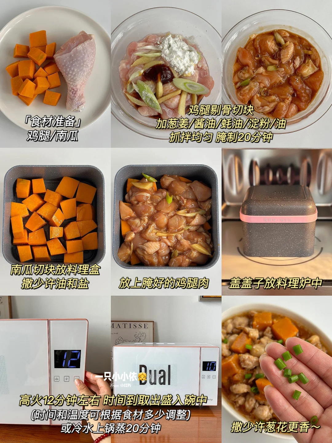 2⃣️南瓜切块铺在料理盒底部,加少许油和盐拌匀,放上腌好的鸡腿肉,盖盖子放入料理炉中,高火12分钟左右(或冷水上锅蒸20分钟);