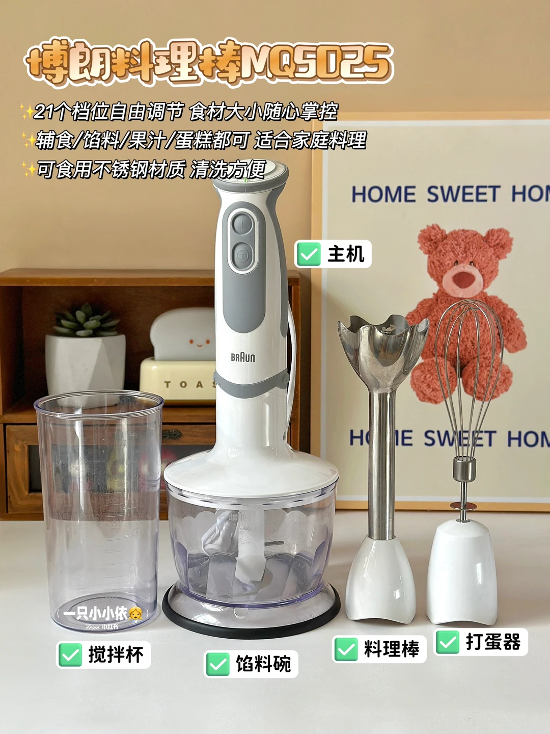 ➡️平常做辅食经常会用到博朗MQ5025料理棒,德国品质,食品级不锈钢材质,用起来更安心😎它有21档精准调速,可以根据宝宝年龄,将食物搅打成不同细腻程度🥕而且它不挑量,即便是辅食初期,也可以打少量辅食,很贴心👏🏻机身自带防飞溅罩,不用担心搅打时溅出来弄脏桌面~它的配件也很丰富,平时做果泥、奶昔、肉饼、丸子、蛋糕等都可以🍞水一冲就干净,收纳也不占空间,实用性和利用率都很高~