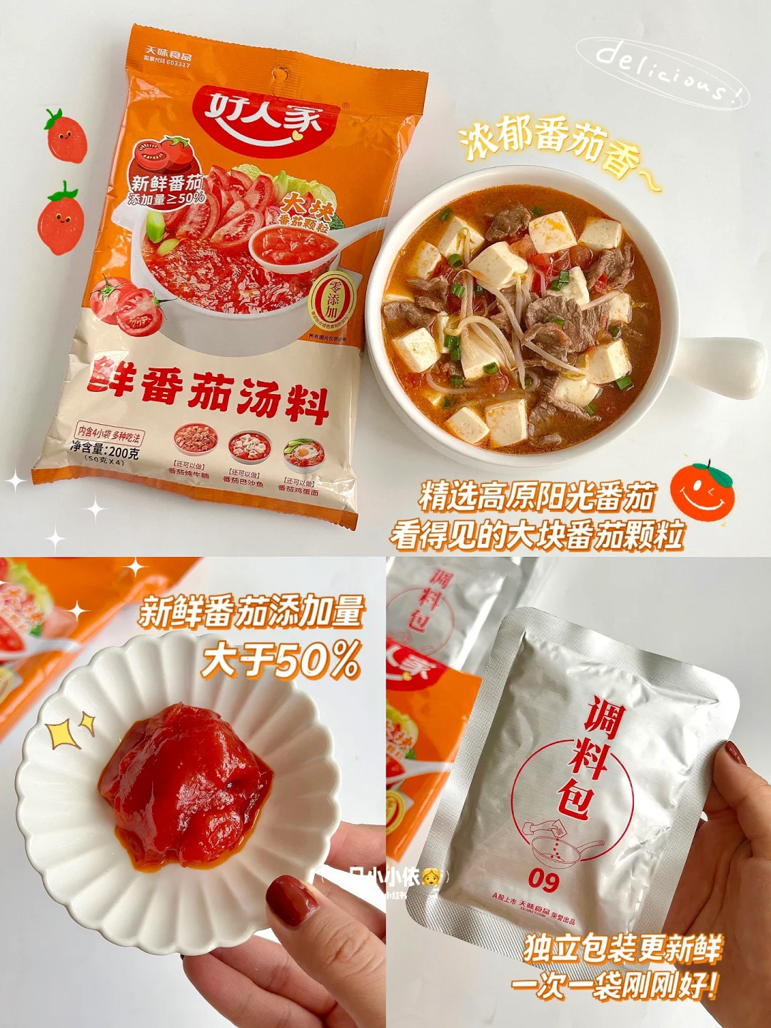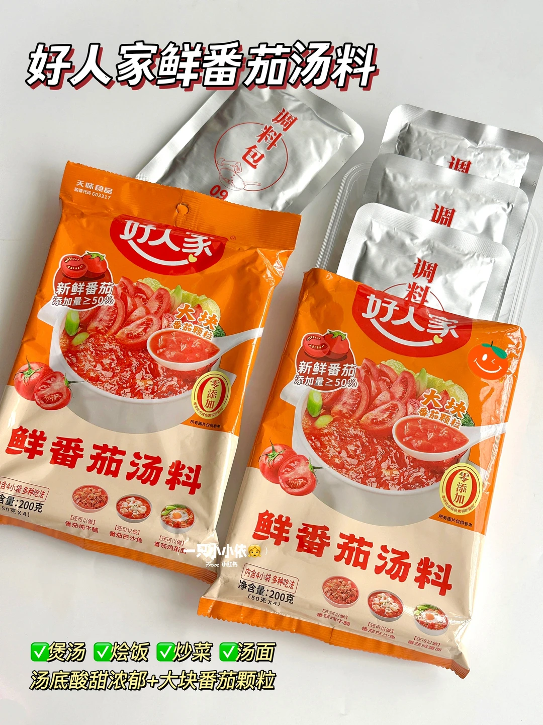 减脂汤好喝的秘密,是酸甜浓郁的番茄汤底🍅最近用的好人家鲜番茄汤料,真滴吼吼吃!👏🏻👏🏻新鲜番茄的添加量含50%以上,肉眼可见大块番茄颗粒😆而且配料也是很干净,没有添加剂等不友好成分,老人、小朋友也能放心吃!👧一袋里有4⃣小包,可以用来煲汤、炒菜、汤面、烩饭,每一口都能尝到新鲜番茄滋味~