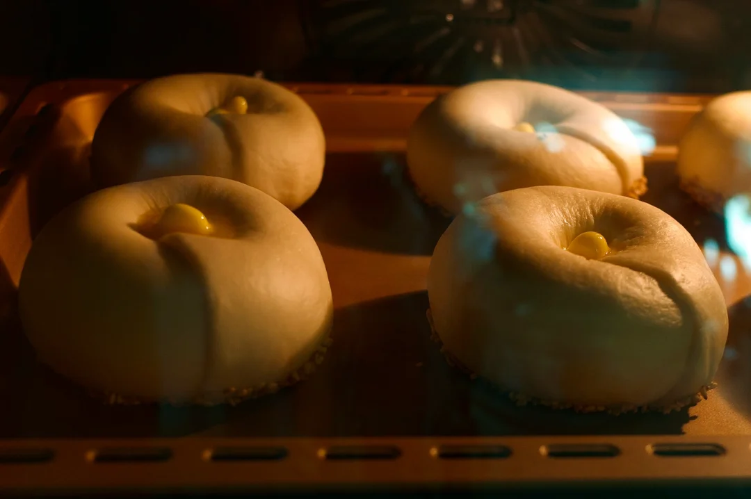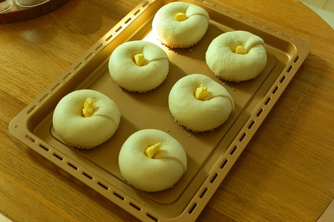7️⃣在每一个贝果中间放3克左右的黄油粒,送进预热好