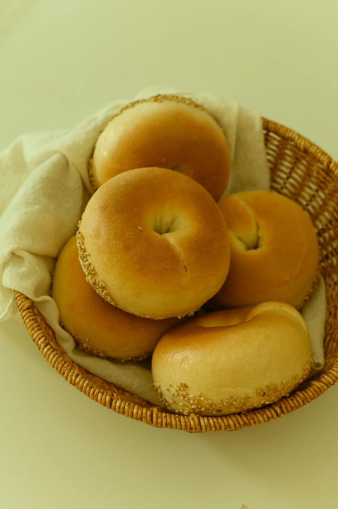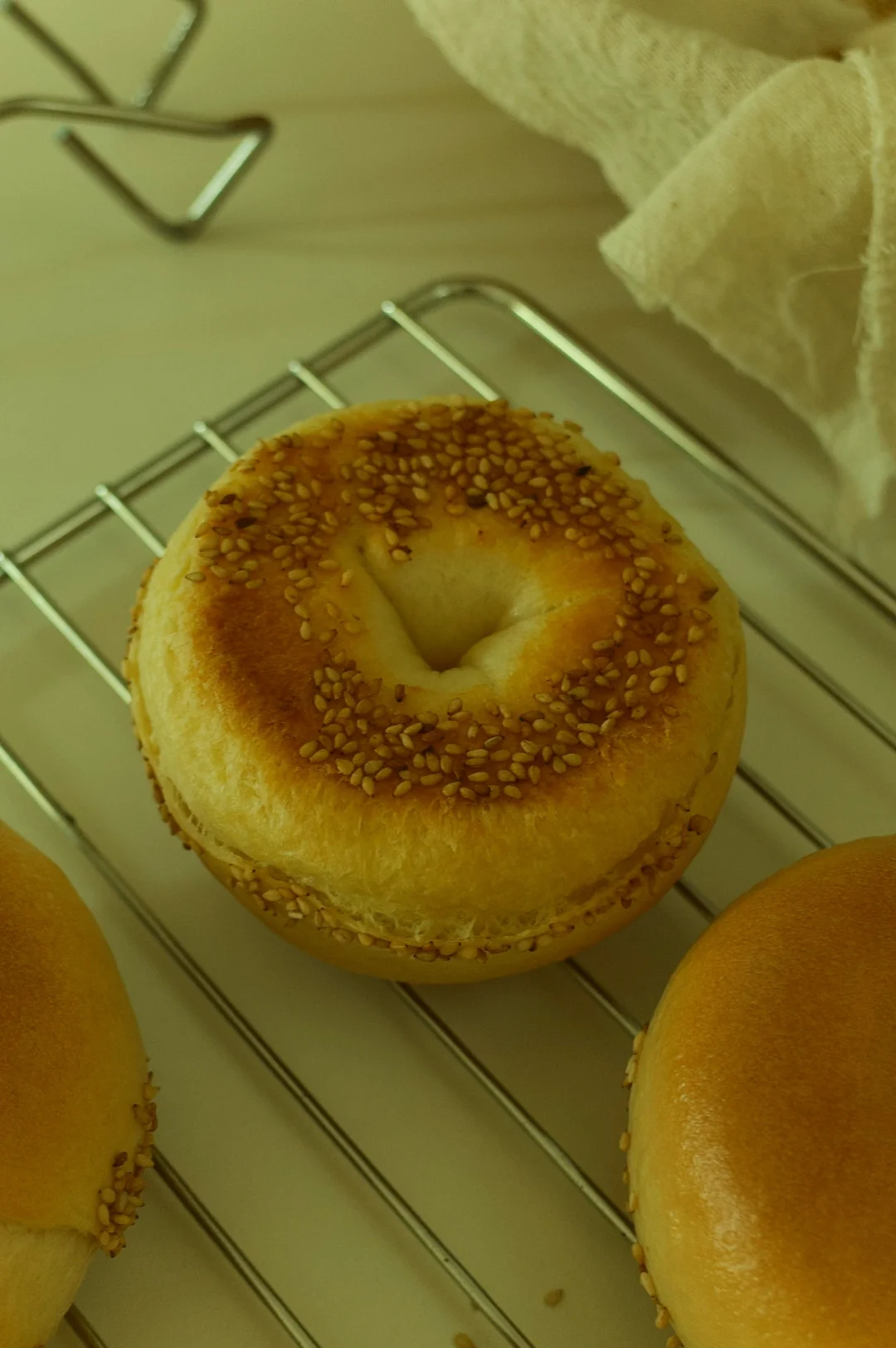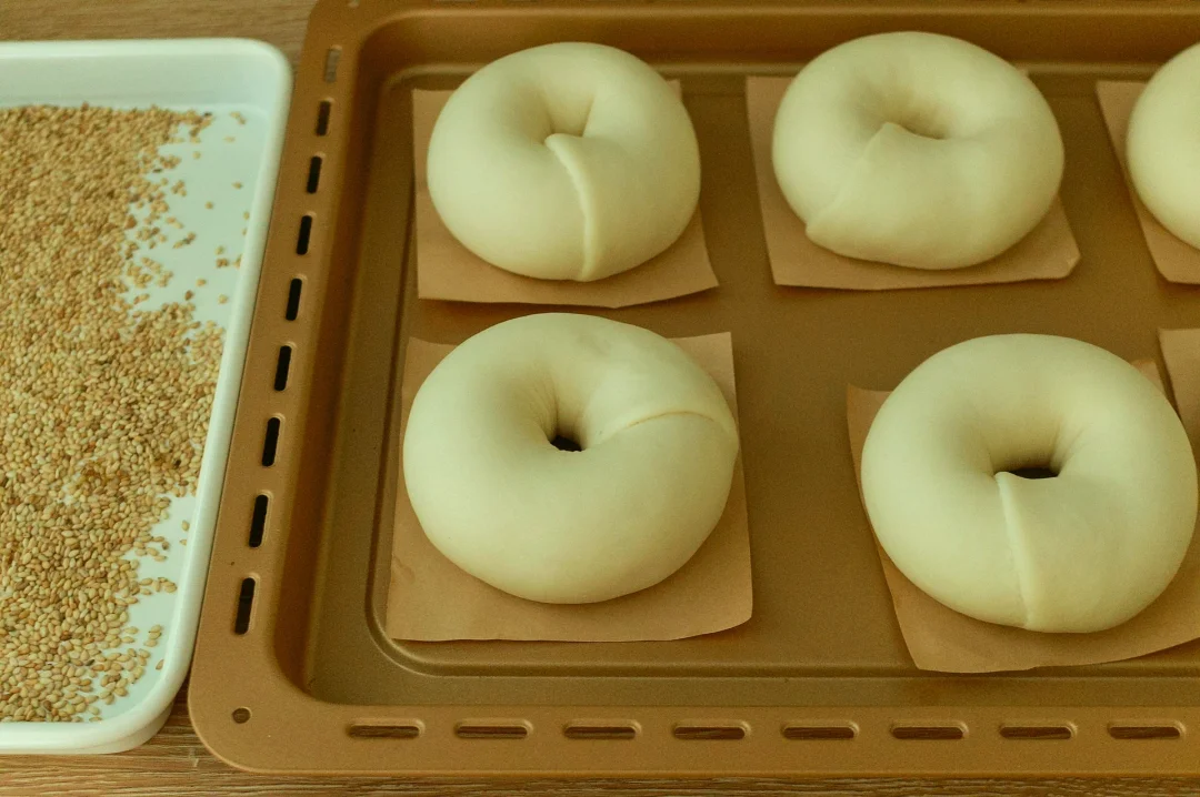 烤的时候满屋飘的黄油香气~烤好的贝果翻过来