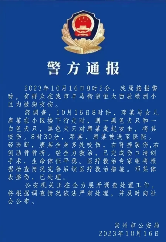 事发时,还有一只白色犬只围在女童附近,但没有攻击。黑狗咬伤人后逃走,民警已到事发小区进行搜寻。据网络聊天记录称,肇事犬系两名年轻女性所养。