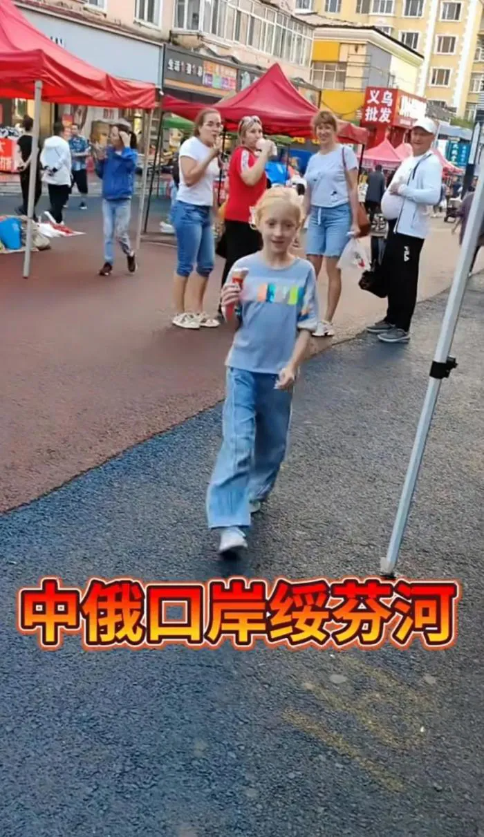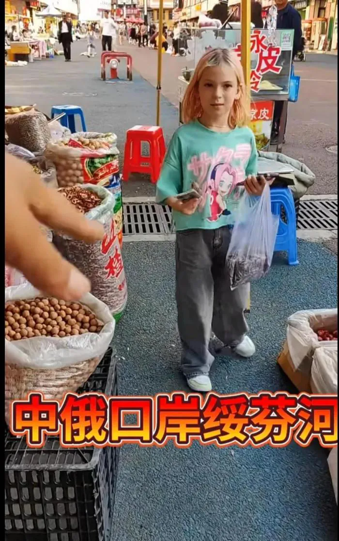 在绥芬河口岸,一个九岁俄罗斯小姑娘独自购买瓜子干果,热情的商家,不但足斤足两给她,临走时还特意抓一把吃的送给她!