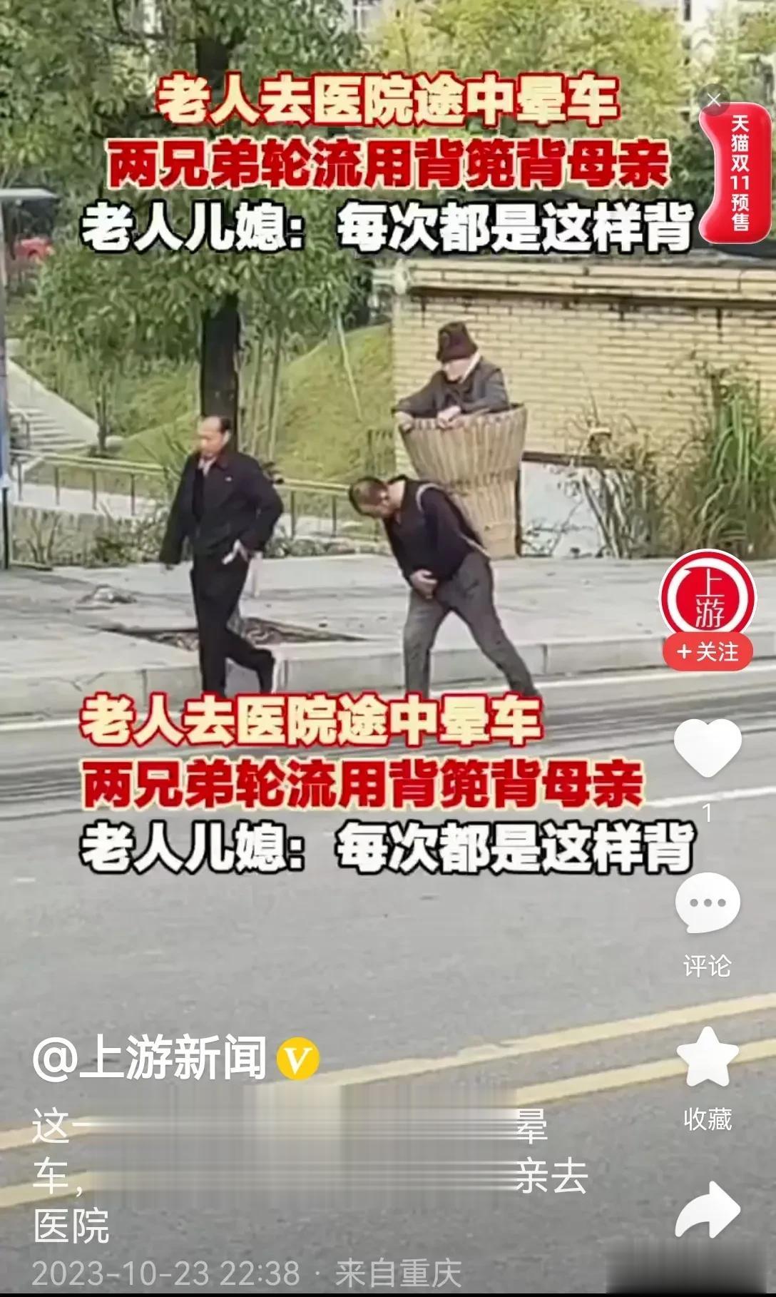 两个兄弟,用箩筐,轮流背着自己的母亲去医院看病。 这是2023年10月23日出现在重庆街头的一幕。 这一幕,着实感人。 这是时下底层社会的至孝图。 我梦野艳齐为什么会这么说? 因为如果这两个兄弟是有钱人,即使母亲晕车,不便自己开车,或雇出租车送自己的母亲去医院,他们也可以雇一帮人,抬个轿子,或用担架,把母亲送到医院去。 他们显然没有这种实力。 但没有这种实力,并没有影响他们对母亲尽最至诚的孝心。 他们用箩筐把自己的母亲背在了背上。 客观地说,他们也已经是属于老人。 他们的头发也已经花白。 但是,他们一步步地毫不犹豫地向前走去。 他们是真正的孝子。 他们懂得作为儿子应当怎样对待自己生身的母亲! 更可圈可点的是,他们的媳妇也都像他们一样,知道如何孝敬他们的母亲。 准确的说,这两个媳妇也是无怨地服侍她们的婆婆。 她们说:需要送老人去医院看病的时候,这两位兄弟若不在,她们也会这样去做。 她们真的是好媳妇,是值得人们敬佩的好媳妇! 与此相对应的是,我在网上在看到这一幕的随后,我又看到了另外一个画面—— 一个儿子发了疯似地于街头踢打自己的母亲,自己的母亲倒地之后,他还不肯停止对母亲的施暴。 这真是天壤之别。 这个儿子忘了他是怎么来到这个世上的了,忘了是谁给了他的生命! 他更是忘了,他也有老的时候! 是个人,到老了的时候,都不愿被自己的儿女所嫌弃。 也就是说,当我们也老了的时候,当我们行动不便难以自理的时候,我们也会渴望能够得到前者的那种真心又无怨的照顾。 是的,我在这里用了无怨两个字。 久病床前无孝子,这几乎是我们这个民族千百年来的定论。 但这一定论,被这两个兄弟在今天打破了。 他们坚定地毫不犹豫地背着自己生病的母亲去医院,这一幕,将永远定格成这个世界一道极为亮丽的风景。 感谢上游新闻这家媒体,把这一幕推送给我们这些观众。 而那个野蛮的像个猛兽发狂般施暴于自己母亲的儿子,将会永远地被人唾弃。 好了,今天的话题,就说到这里。 感谢您的收看。梦野艳齐。
