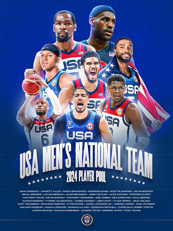 巴姆·阿德巴约、贾勒特·阿伦、保罗·班凯罗、戴斯蒙德·贝恩、斯科蒂·巴恩斯、德文·布克、米卡尔·布里奇斯、杰伦·布朗、杰伦·布伦森、吉米·巴特勒、亚历克斯·卡鲁索、斯蒂芬·库里、安东尼·戴维斯、凯文·杜兰特、安东尼·爱德华兹、乔尔·恩比德、达龙·福克斯、保罗·乔治、阿隆·戈登、泰雷塞·哈利伯顿、詹姆斯·哈登、约什·哈特、泰勒·希罗、朱·霍勒迪、切特·霍姆格伦、布兰登·英格拉姆、凯里·欧文、小贾伦·杰克逊、勒布朗·詹姆斯、卡梅隆·约翰逊、沃克·凯斯勒、科怀·伦纳德、达米安·利拉德、多诺万·米切尔、克里斯·保罗、鲍比·波蒂斯、奥斯汀·里夫斯、邓肯·罗宾逊、杰森·塔图姆、德里克·怀特、特雷·杨。