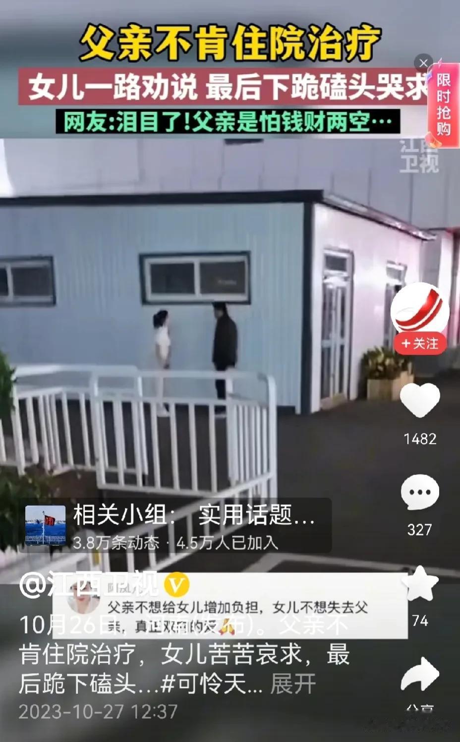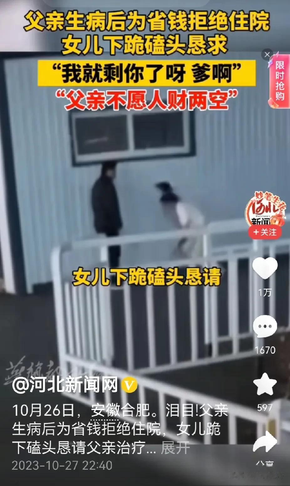 我就剩下您了!——一个当女儿的当街向她的父亲下跪,并哭着喊出了这样一句话。 这一幕,让我动容。 在这世上,父母养育儿女,大多不求回报,但是儿女一旦有所回报,当父母的会感到欣慰,世人也会对这样的儿女刮目相看。 一位父亲,患了难治之病,而决定放弃治疗。她的女儿跪求他: 我就剩下您了! 这一幕,出现在我梦野艳齐的面前的时候,我真的是深深地受到感动。 我感动于这位父亲为自己的女儿着想,怕为了自己看病,花费过高,而使女儿在经济上难以承受。 感动于这位女儿怕失去父亲,急的跪地磕头,哭求父亲:我就剩了您啊! 这是多家媒体近日发布于网上的报道。 根据这篇报道,我可以推断出—— 这位父亲的身体出现了不适,女儿便带着他去了医院。 但结果,大夫一定是告诉了这位父亲有关身体方面不太好的信息,且治疗起来费用很高,又无法保证最终能够100%的治好,而父亲又肯定是意识到,如果不能将病治好,却又会白白花去许多钱,那就会给自己的女儿带来沉重的经济上的负担,于是,父亲趁着女儿不身边,而走出诊疗室而要离开医院,女儿发现后,追赶了上来,拉着他,要他跟着她返回去,去办理住院手续,但这位父亲不从,女儿情急之下,便跪下来,便哀求他: 我就剩下您了! 从他们二人的对话中,我能分析出,这个女儿是这位父亲的独生女儿,而这位女儿的母亲已经离世。 这位女儿的意思,显然是,就是有1%的希望,我也不能放弃您!您是我的父亲,没有您,这世上哪会有我?我的一切是因为您的存在才存在!为了治您的病,为了您能继续活在这个世上,为了继续让我天天能看到您,花再多的钱,就是没钱去借钱,去背债,我也在所不惜! 这真是一个好女儿! 许多网友跟我梦野艳齐一样,看了这一幕之后,也深深地被感动。 新疆的盈夏心语说—— 女儿的孝心感天动地,为有这样的好女儿点赞! 辽宁的明前炒青说—— 中国人的孝道,中国人的价值观! 上海秋实99说—— 父爱如山,儿女当涌泉相报!