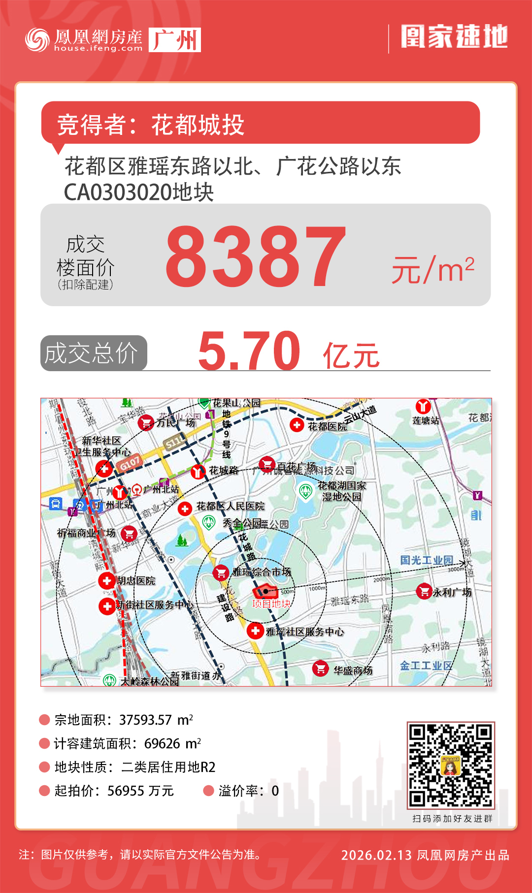 2月13日10时30分,花都区雅瑶东路以北、广花公路以东CA0303020地块限时竞拍,由广州市花都区恒悦房地产开发有限公司,归属花都城投,以总价5.70亿元竞得,扣除配建后,折合楼面价为8387元/平。