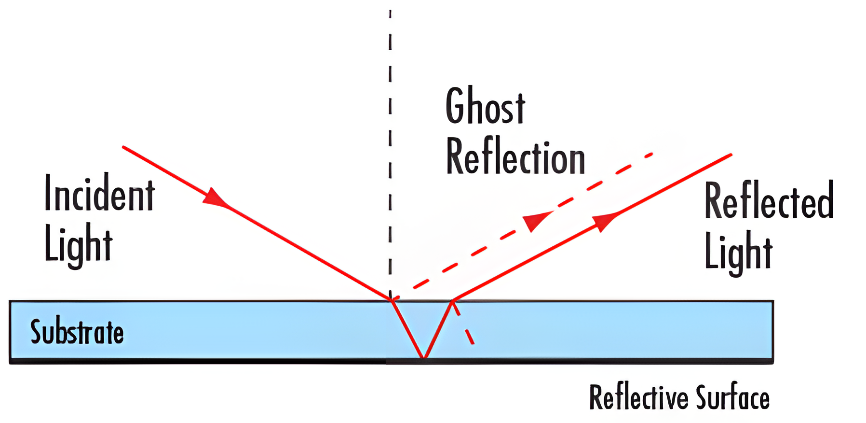 1.鬼影(Ghosting):光线在玻璃前表面发生菲涅尔反射(Fresnel Reflection),产生一个微弱的副像(图中红色虚线所示)。