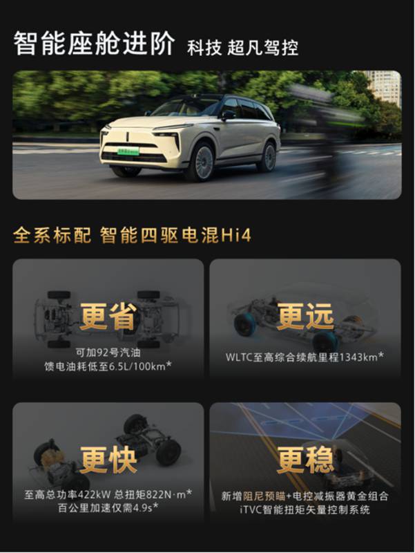 Hi4性能版,是全球首创的四挡全速域直驱技术。在路上的表现可概括为:跑得省、跑得远、跑得快、跑得稳。在4.9秒零百加速性能的同时,还能达成6.5L/100km的超低馈电油耗,更能带来1343km综合续航。并通过前后50:50轴荷分配与iTVC智能扭矩控制,为全家出行提供了从容安稳的驾乘体验。真正实现了“四驱的性能,两驱的花费”。