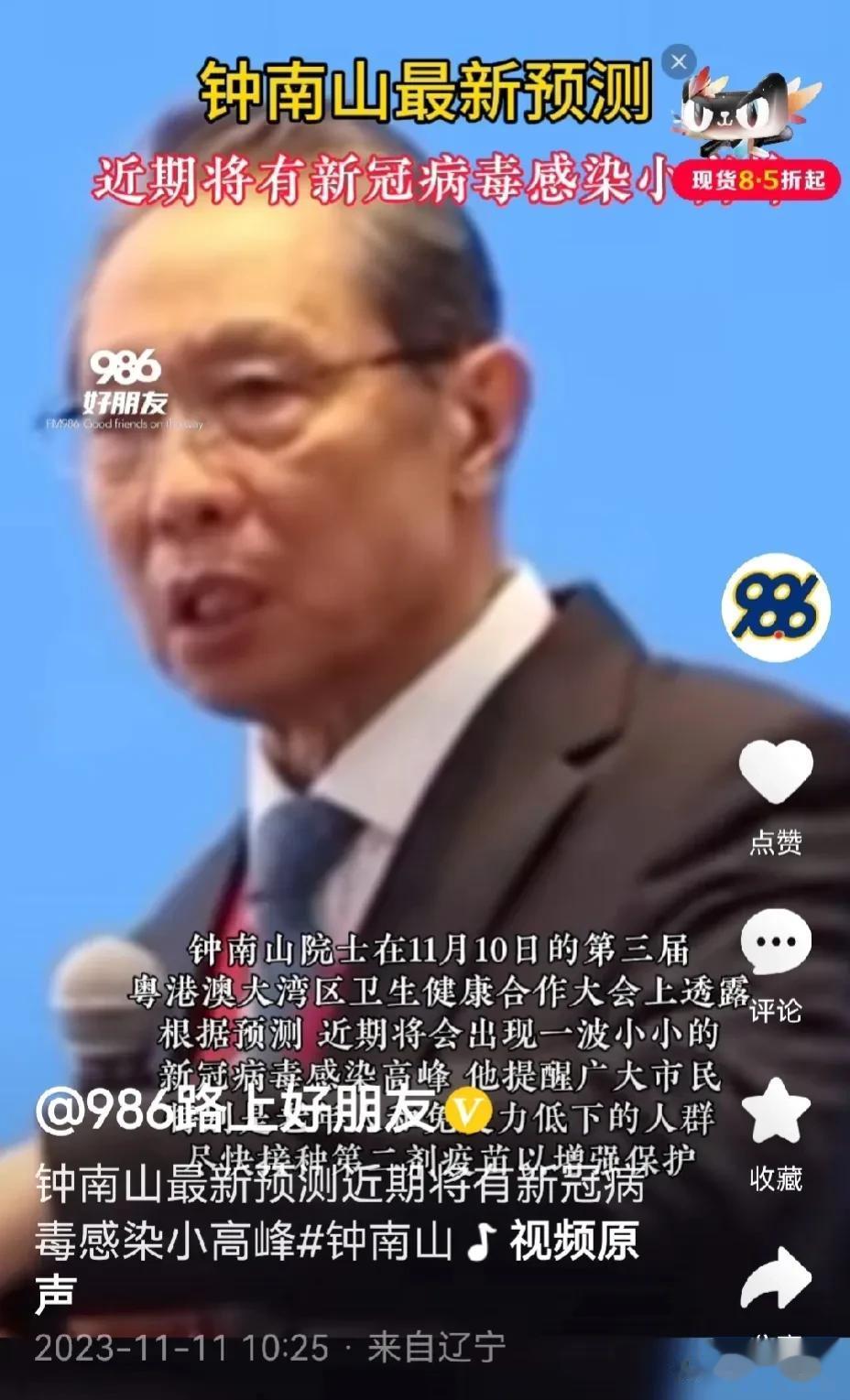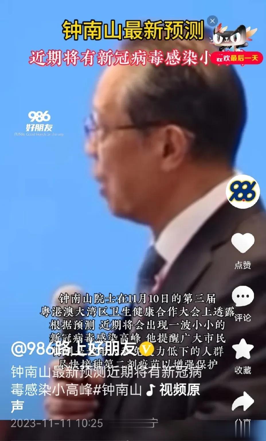外出到人多的地方,还得戴口罩。 我梦野艳齐为什么会想到这个话题? 因为我刚刚得到消息—— 钟南山院土最新预测:近期将有新冠病毒感染一波小小的高峰。 他这话是什么意思? 他这话的意思是,近期新冠病毒的感染者有可能有所增多。 因为这个季节的气温在下降,这种病毒的存活率有所增强。 他钟南山院士是什么时候说的这句话? 他钟南山是在11月10日的第三届 粤港澳大湾区卫生健康合作大会上说的这句话。 他提醒世人在这个时候还不能掉以轻心,要坚持自我防护,免得在无意中遭遇感染。 我梦野艳齐相信钟南山院士说的言之有据。 而我的这条消息也不是道听途说,属于什么谣言。 我的这条消息来自于沈阳广播电视台FM98.6官方账号。 好了,今天的话题,就说到这里。 感谢您的收看。梦野艳齐。