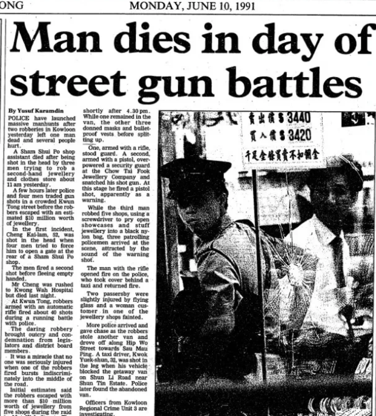 巧的是,他们三人上午抢劫深水埗钟表店,下午叶继欢抢劫观塘金店,还拿着56式自动步枪在街头跟警员发生激烈枪战。