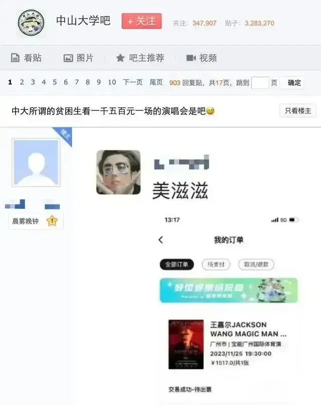 而且还购买了某明星将于11月25日在广州举行的演唱会门票,票价达到1517元。帖文中,爆料网友还公开了这名获得助学金学生的学号信息。