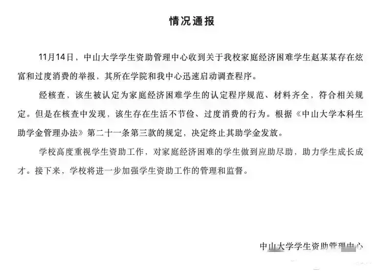 最近,中山大学就此事发布了相关通报,通报表示,经过仔细核实调查,该生特困生认定程序规范、材料齐全,符合特困生条件。但该生也确实存在生活不节俭、过度消费的不良行为,学校决定终止对其发放助学金。对此结果,网上一片叫好。