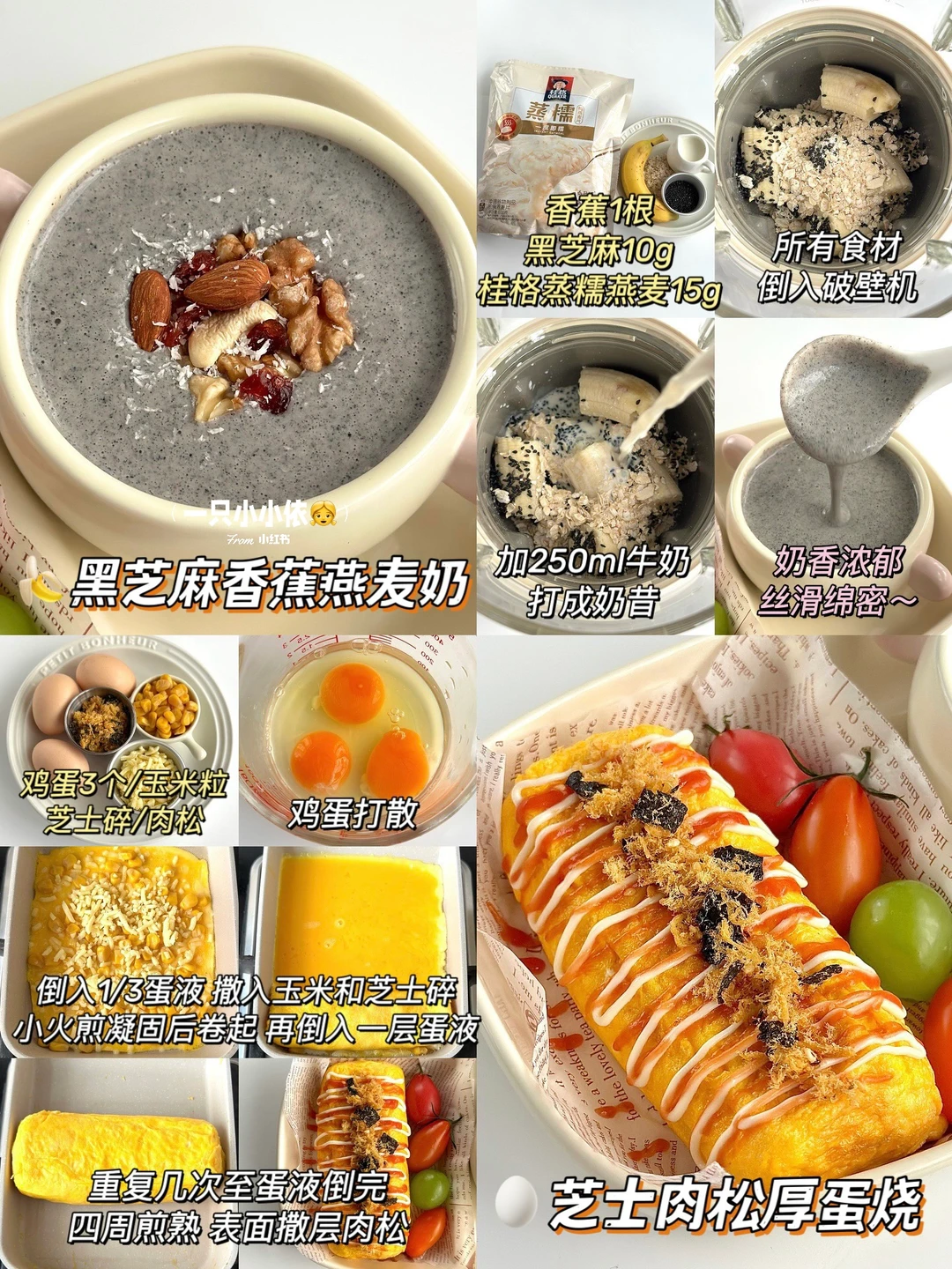 DAY 1:黑芝麻香蕉糯燕麦奶&芝士肉松厚蛋烧