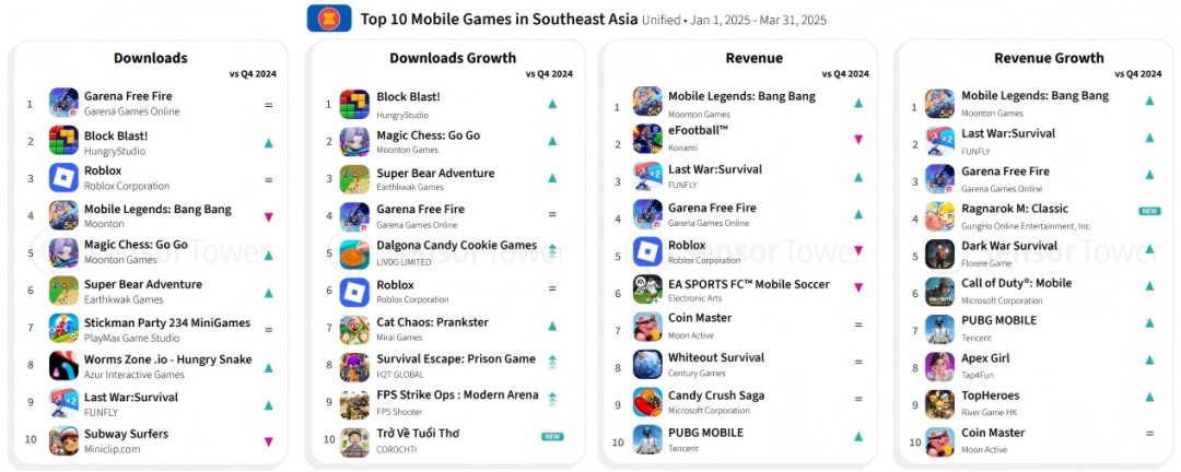 Sensor Towe发布的2025第一季度东南亚地区手游下载、收入TOP10排行榜,MLBB的收入榜位居第一,下载榜位列第四,甚至它的衍生产品MGCC在下载榜和下载增长榜单中都能排到了第5和第2。