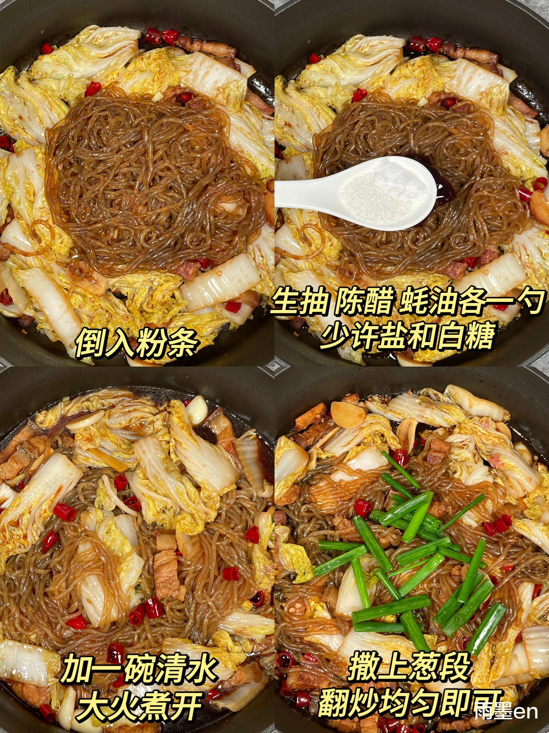 水开后放入泡好的粉条,粉条要顺着锅边铺在菜上,别搅拌太勤(技巧预警!),盖上锅盖转小火炖15分钟。最后开盖根据口味加盐调味,大火收汁3分钟,让粉条充分吸收汤汁的香味,直到汤汁变得浓稠发亮就可以关火啦。撒上一把葱花,端上桌的时候还在咕嘟冒泡,香味能飘满整个屋子!