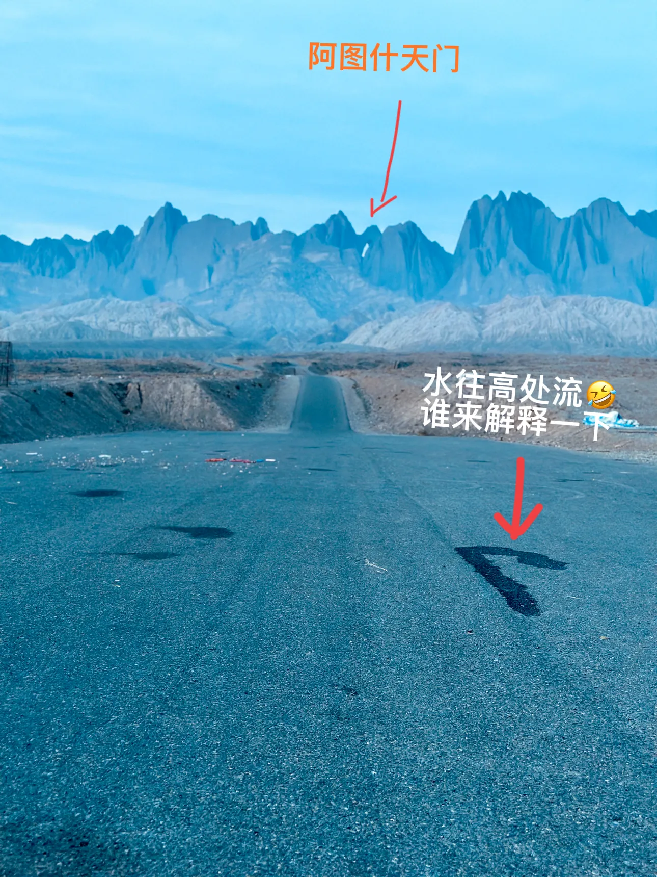 顺便说,怪坡就在阿图什天门背后,在这边看天门就是个洞[笑哭],不过这里过不去,开车要绕100多公里才到天门。