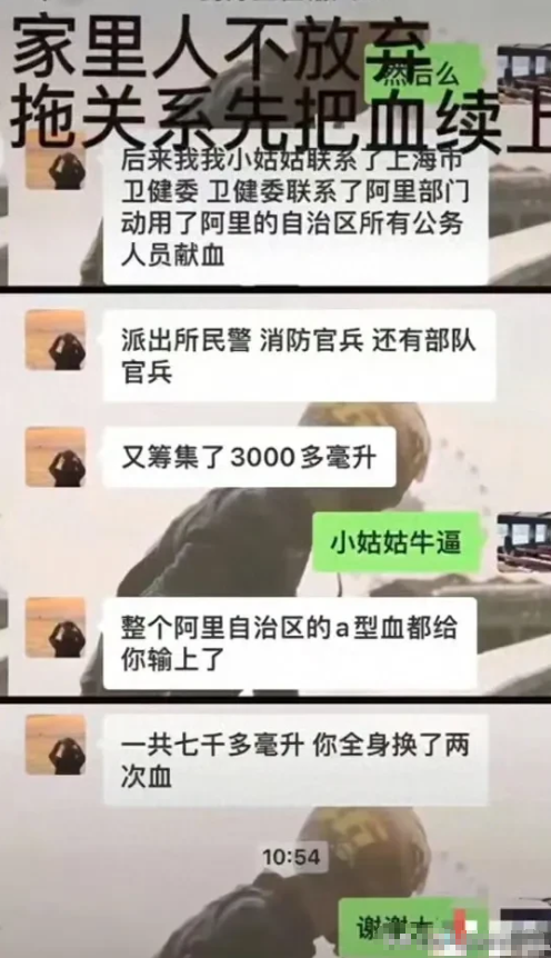 上海女子车祸后炫耀小姑子动用关系,让西藏阿里全体公务员献血3000多毫升,爸爸包机送她回四川华西治疗。女子丈夫回应:不实,献血不是强制的,剩下的血存在医院血库,不是只给我们用。妻子遭指责心情低落,哭过一次,希望大家理性对待。