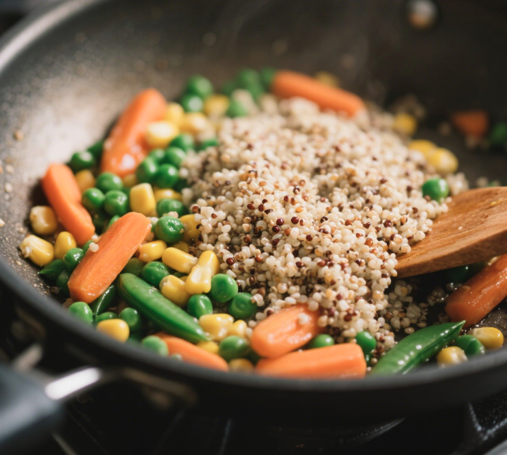这时,我将煮好的藜麦倒入锅中。藜麦一入锅,就像一群欢快的小精灵,与蔬菜们紧紧相拥。我用铲子将它们充分翻炒均匀,让每一颗藜麦都裹上蔬菜的清香。在翻炒的过程中,藜麦与蔬菜相互碰撞、相互融合,发出“沙沙”的声响,仿佛在诉说着它们的故事。