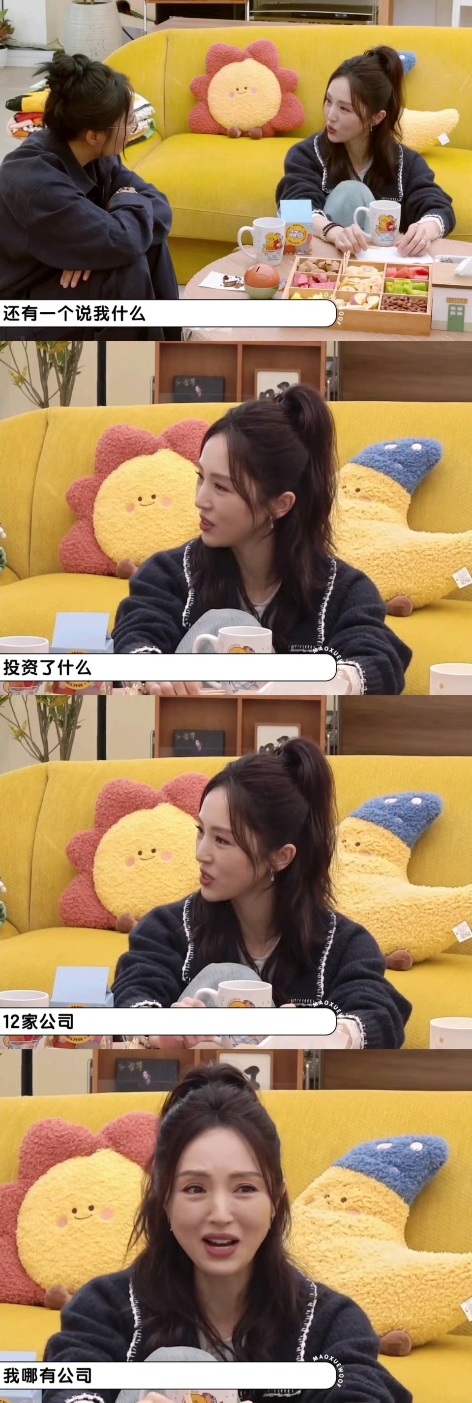 事情是这样的,董璇一上来就开启吐槽模式:“网上那些热搜,假的离谱!什么‘婚礼餐标67元’‘投资12家公司’,我直接黑人问号脸?”她边说边模仿网友吃瓜表情,把毛不易和李雪琴逗得前仰后合。原来,有网友爆料董璇再婚婚礼“寒酸”,酒席三桌、人均67元,甚至还扯出“投资12家公司”的离谱传闻。董璇当场翻白眼:“我连公司门朝哪开都不知道!”