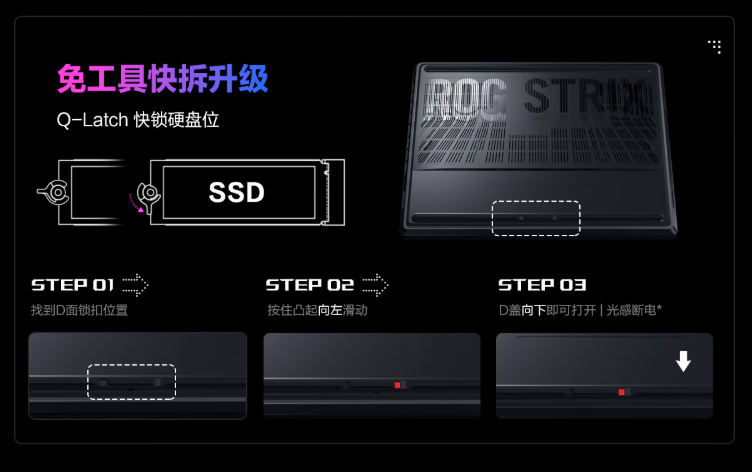 ROG魔霸新锐2025还在机身设计上暗藏巧思,底部免工具快拆设计,徒手即可完成硬件升级,轻松拓展性能上限;丰富接口配置覆盖外设连接、快充等多元需求,全方位适配电竞场景。
