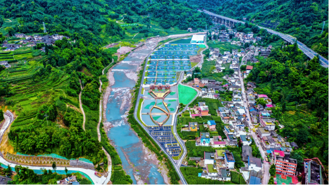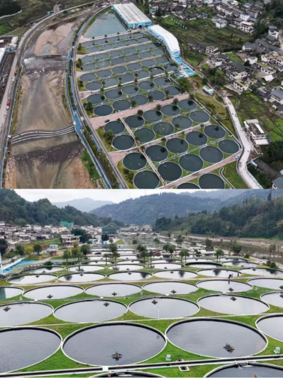 下图:雅安天全水产现代农业园里,一百多个圆形流水鱼池依河而建,养殖面积达到4.6万平方米。(图源:天全县融媒体中心)