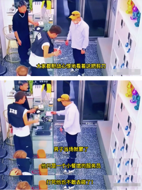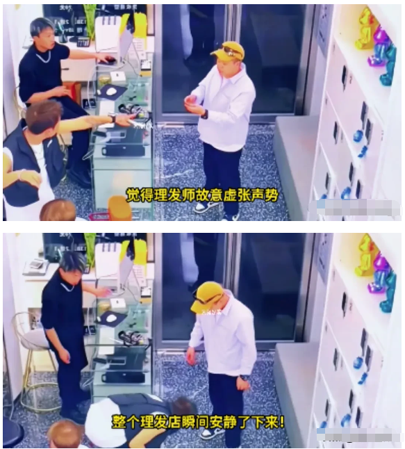一旁的理发师看到后,急忙进行制止,告诉男子,这把剪刀很贵的,别乱动!弄坏了,你赔不起!