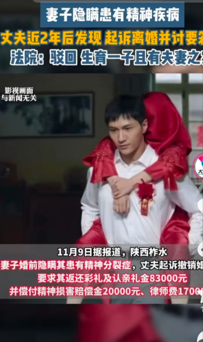 陕西,男子发现妻子怀孕后大小便都在屋里,才知道妻子是精神分裂症患者,儿子出生后,他申请撤销婚姻。之后以岳父婚前欺瞒为由告上法庭,要求对方返还60000元彩礼,23000认亲礼,精神赔偿金20000元等共计12万。法院判了!