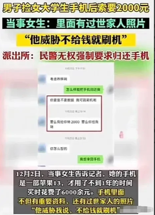 安徽合肥,女大学生用餐时,把手机弄丢了,报警后,通过监控看到遗忘在取餐处的手机被一名男子拿走,随后,女大学生在民警的帮助下找到男子,本以为手机可以找回来了,谁料男子承认拿走了手机,但是却向其索要2000元,并威胁不给就刷机。女子想让民警再帮帮忙,民警:“无权强制要求归还,建议起诉”。(来源:长江日报等)