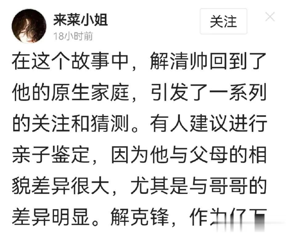 网上又曝热点,有人说解克锋没做亲子鉴定,就认解清帅为自己的亲生儿子,引发质疑。 质疑什么?无非是质疑他们之间是否存在着血缘关系。 发出此信息的人,网名叫来菜小姐。 她说——有人建议进行亲子鉴定,因为他与父母的相貌差异很大,尤其是与哥的差异明显。 对于这位女士的如此言说,我梦野艳齐不愿去做任何评判。 这毕竟是人家的私事,人家不愿去那样做,是人家自己的权利,人家恐怕也有着自己的考虑,外人没必要说三道四,疑神疑鬼。 在这里,我梦野艳齐想说的是——解清帅着实是赶上了好运。 要知道,在此之前,他只是一个成天挤公交车的普通打工仔,而被解克锋认可了他与自己的父子关系之后,不仅身价倍增,而且,马上便可开上宝马X5。 当然,据解清帅自己说,他并没有马上接手父亲送给他的这辆车,而是暂且回到了他工作的地方四川。 但不管怎么说,能拥有一辆宝马X五,对于一般的与他同龄的年轻人来讲,可谓是一种梦想。 1999年1月20日,三个多月大的他,在家中店铺中被人偷走,被拐卖到了距自家所在地邢台四五十公里之外的邯郸。 在此后的25年之间,他的养父去世之后,他的养母改嫁他人,他是靠他的爷爷奶奶把他带大,最后,他考上了大学。 25年之后,他从一个靠给别人干活维持温饱的打工仔,一跃,进入了富二代阶层。 这故事真的有点鲤鱼跳龙门的意味。 但它又是发生在人们的现实生活之中,而并非是带有虚构色彩的民间传说。 网传,他的这位生父要送给他的这辆宝马X五,落地价,在65万元左右。 有人说,解清帅在四川打工工资是每月5000元左右,而要买这种车,即便不吃不喝也需要140个月的工资,大概需要他努力12年! 140个月,12年,这着实是一个不小的数字。 而解清帅是举手即得,这不是幸福,又是什么? 在这里,我梦野艳齐还需要说的是,据网上的百科词条介绍,解克锋,河北省邢台市企业家,邢台市同嘉商品混凝土有限公司、邢台天龙爆破拆除有限公司、邢台市襄都仓储配送服务有限公司、邢台锦天龙建筑拆除工程有限公司、邢台市栋梁城市房屋拆迁有限责任公司等多家公司的大股东,在多家公司任高管。 1996年,他开始承包建筑工程项目,而在1998年10月14日,他的二儿子出生。 这个二儿子,便是次年1月20日在家中店铺丢失的解清帅。 儿子丢失后,解克锋踏上了寻子之路,第一年就花光了家中积蓄。 当他凭借自身的努力成为身价千万的企业家后,开始悬赏百万寻找儿子线索。 2023年12月1日,解克锋在警方的帮助下,终于找回了自己丢失25年的这个儿子。 这个儿子的命运由此,也便来了个大逆转。 最起码,他的这个儿子在短短的几天的时间之内,变成了拥有上百万粉丝的网红。 而且,普通人的生活和富二代的生活,其差别,由此凸显。普通人,你即便努力十几年,也不一定能拥有人家如此一来即可拥有的一台车的身价。 由此,也就引出了我在此文开头提到的那位来菜小姐的那番言说。 重复地说,对于解克锋做不做亲子鉴定就认了这个儿子,我梦野艳齐梦不想多嘴,但对于解清帅转瞬之间,从一个每月靠5000来块钱工资维持生活的打工仔,想开就能开上宝马X5,我说他的确是太幸福了。 不说这是一步登天,也称得上是时来运转。 而在网上,他之所以会引来这么多人的关注,很大的原因,就是在于他这一下子,便从社会的最底层跃升至万众瞩目的位置。 那些在网上连篇累牍的对此发文的人中,羡慕者有之,嫉妒者显然亦有之。 他们恨自己怎么没遇上这样一对好父母! 摆脱贫穷,是时下众多年轻人的心中梦想。 而摆脱贫穷的标志,便是有房有车。 有房,对于拥有三套房产者的二儿子,绝对是已经不在话下。 而在日后到哪里去,都不用再去挤公交车,挤地铁,或骑自行车,对于他来讲也变得顺理成章。 这怎么能不让与他同龄的众多的网民羡慕至极,而生嫉妒之心呢? 他们在网上鼓动解克锋去做亲子鉴定,恐怕也正是其缘由之一。 这也真是人一旦运气来了,城墙都挡不住。 这也真是——命,是谁也无法改变的,而运,却可以借助某种机缘,而使我们的处境实现改观。 人们值得羡慕这个解清帅,但没有必要去嫉妒这个解清帅。 这个世界上只有一个县解清帅,而众多的则是我们自己。 我们自己还得靠努力,还得靠奋斗,还得靠拼搏,还得靠一天8个小时地去工作,来实现自我的梦想。 即使你一辈子没房住,一辈子开不上宝马X5,也不要太灰心! 人来到这个世上就是走一走。 只要活得开心就好,只要活得对未来充满向往和自信就好。 好了,今天的话题,就说到这里。 在本文结束的时候,我不妨附上解清帅在网上发布的一段感言—— 能够找到自己的家人,我非常的开心,也希望大家能够跟我一样,有这种开心的心情。 感谢您的收看。梦野艳齐。