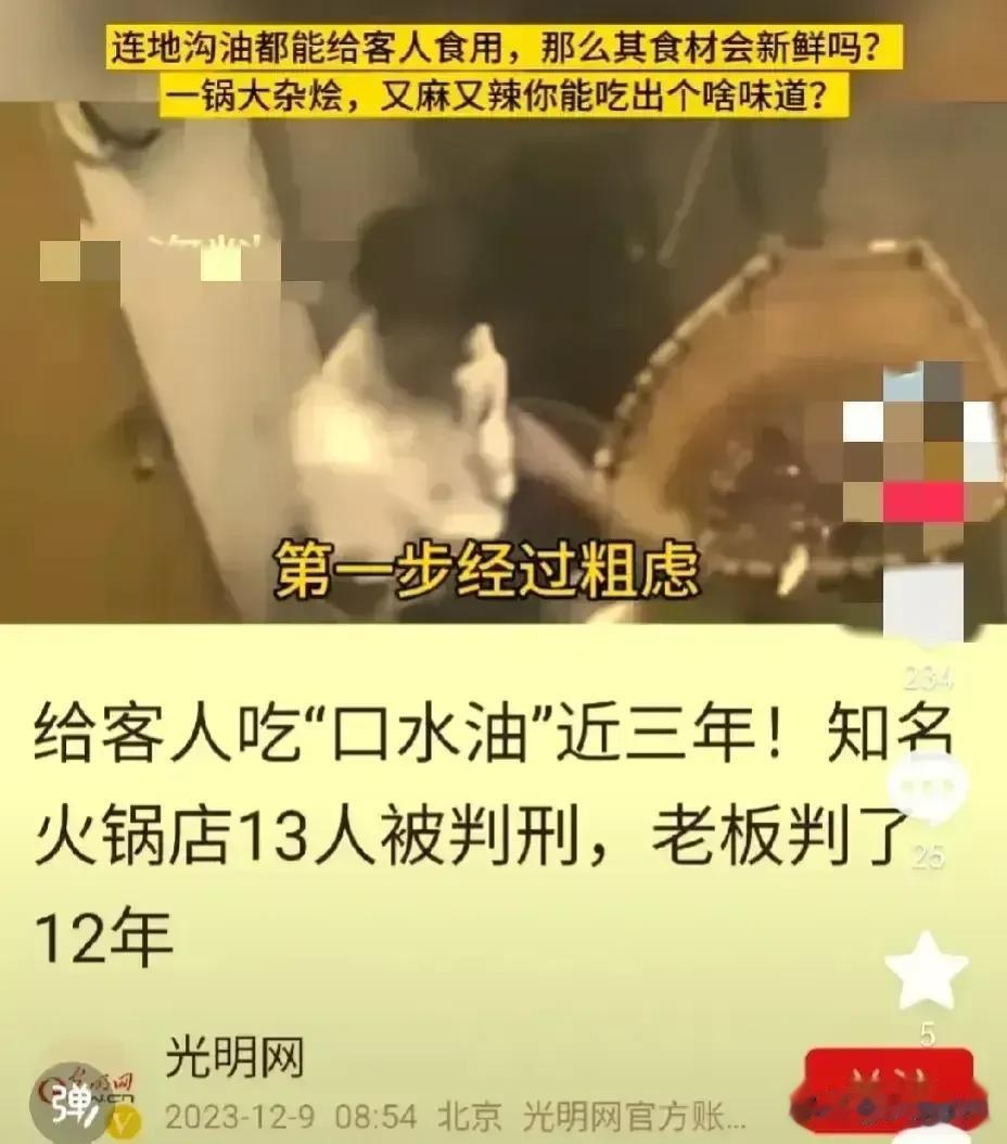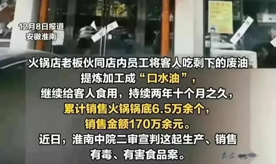 吃火锅的季节到了。当您坐在火锅店里,吃着热腾腾的火锅,你能否想到,你也是在吃着别人的口水,吃着别人的唾沫?! 我梦野艳齐在这里,不是耸人听闻。 这天底下就是有那么一些坏人,专干你想不到的坏事! 火锅很好吃,涮肉很好吃,而这一切都产生于锅底。 锅底,指的是什么? 锅底,指的就是由火锅店的厨师用多种佐料调制好的用于涮肉的底汤。 这底汤,开火锅店的人,他们能做什么手脚? 他们还真能做手脚! 一拨食客用这底汤涮完了肉,杵了无数次筷子之后,前台的人不是把它倒掉,而是悄悄地又将之端回了后厨。 后厨的人,则用滤网篦出那些佐料的残渣,剩下的汤便存放在一起,等着飘起浮水。 然后,他们又用这种浮油掺和进新一轮的火锅底汤,二次上桌,给又一拨来吃火锅的食客又端了上去。 您说,这汤让人恶心不恶心? 这汤里会有多少上拨食客的唾沫搅和在里面! 这些唾沫要是来自有传染病之人的口内,您岂不会在想都想不到中被传上您怕传上的病! 真是这天底下什么样的坏人都有! 防不胜防啊! 到火锅店里去吃火锅的人,还真得加些小心。 不知你什么时候会遇上那些黑心的厨师,那些黑心的老板,那些黑心的前台服务人员,合起伙来,让你吃一顿香喷喷、辣乎乎,但又让你一旦知道这种秘密之后,想起来恶心,想吐都吐不出来的火锅! 为了证实我说的上述这一切,不是信口而言,现将一权威媒体对这种事的报道附录如下。 2023年12月9日8点54分,北京光明网官方账号综合大皖新闻、安徽商报消息—— 近日,淮南中院二审宣判了一起生产、销售有毒、有害食品案。 入川毛肚火锅店于2017年4月开业,是当地知名火锅品牌,由牛某投资,王某负责日常经营管理。 为节约经营成本,2019年1月1日至2021年10月21日期间,王某、牛某等人伙同厨师长及后厨工作人员、前厅经理等人,等顾客吃完火锅后,将含有牛油的火锅汤倒入放有滤网的桶内,将火锅的残渣过滤掉,将浮在上面的油品收集存放,次日,向顾客下单的火锅中添加,给顾客食用。 至案发时,入川毛肚火锅店累计销售火锅锅底6.5万余个。经鉴定、审计,涉案火锅锅底销售金额共计170万余元。 牛某、王某等13名被告人,由此,被淮南中院裁定,维持一审判决,分别被判处有期徒刑十二年至一年。
