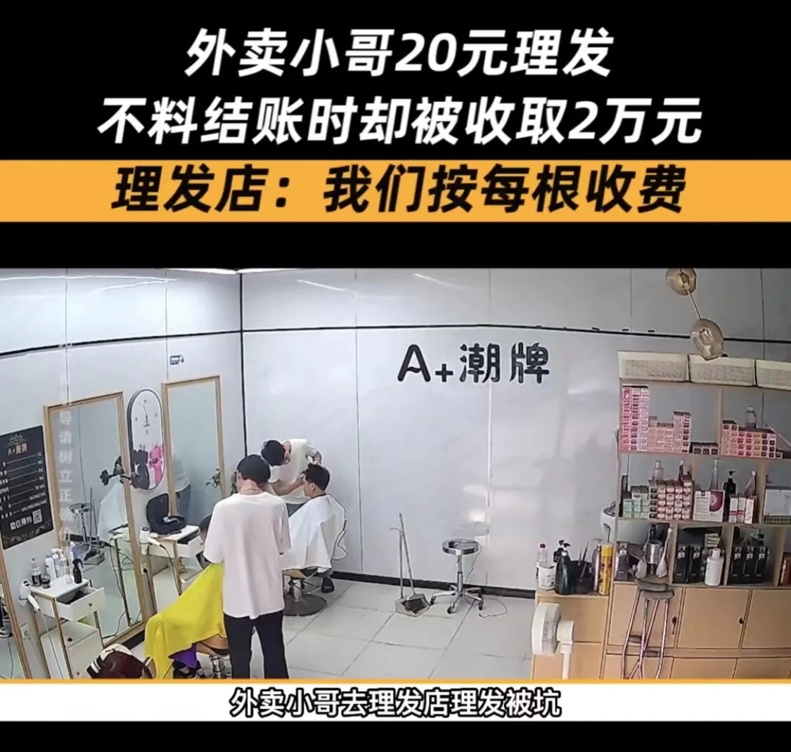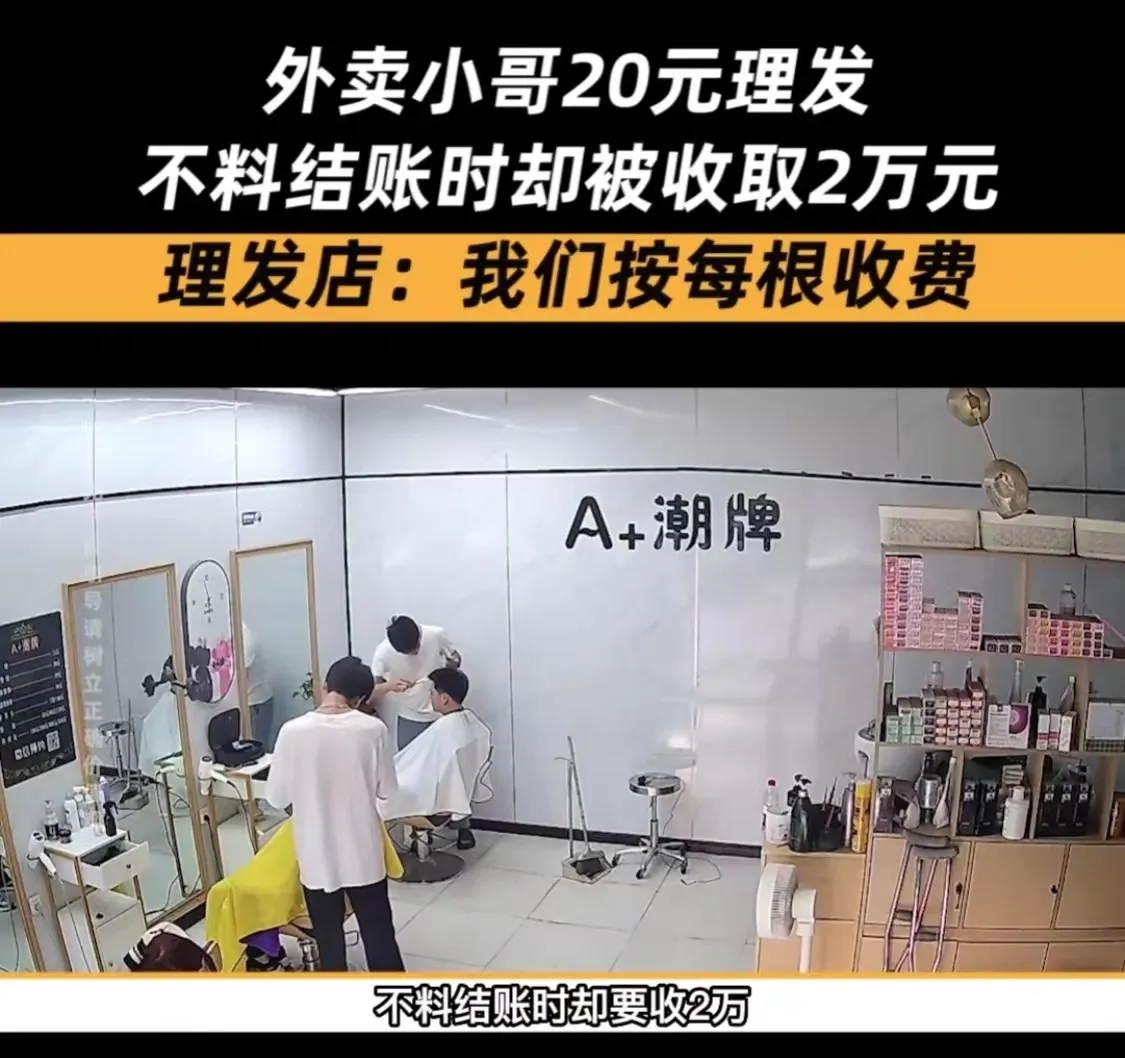 浙江湖州,小伙去理发店理发,说好的洗剪吹20元,不料一顿操作之后,结账时竟要收20000元,店家:我们按头发根数收费,小伙:城市套路深,我要回农村!