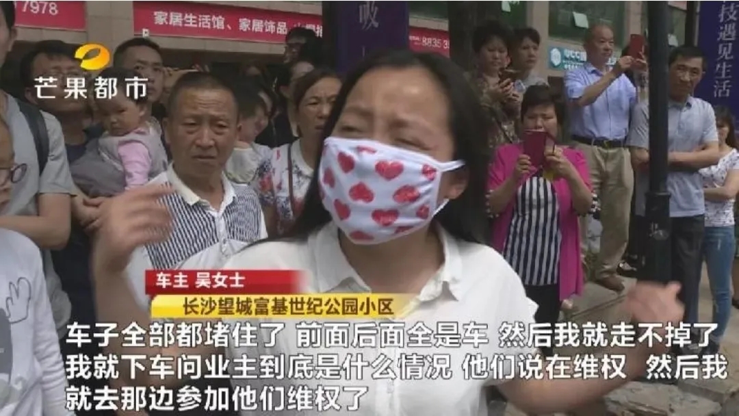 吴女士是长沙望城富基世纪公园小区的居民,事发当天11时许,吴女士准备开车出去玩,驾车行至小区门口时,发现小区门口被堵得水泄不通,前后左右都是车,根本无法动弹。