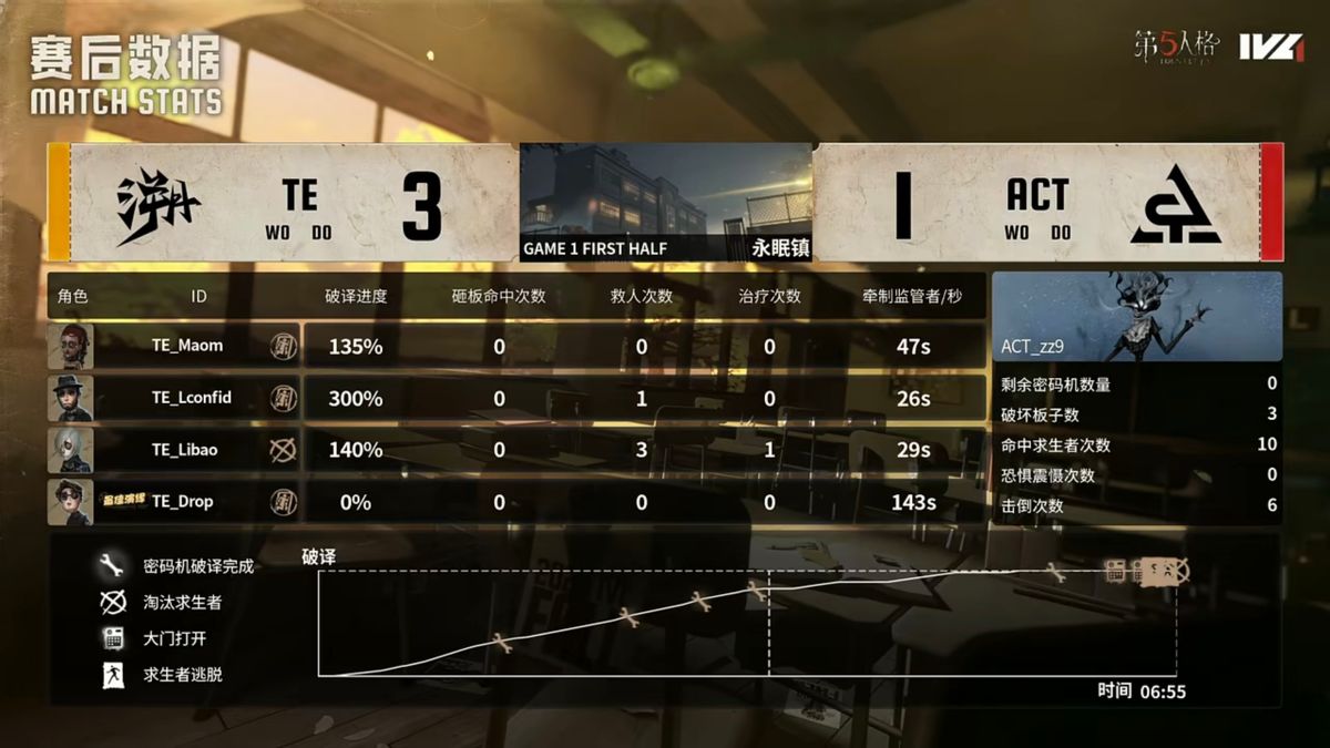 TE的求生者选择了幸运儿、魔术师、守墓人、咒术师;ACT的监管者zz9选择了时空之影。(BAN先知、大副、教授、飞行家)