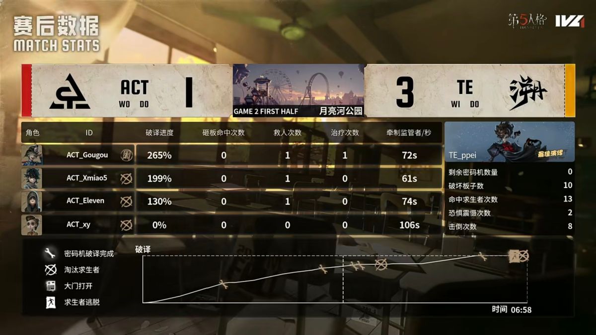 ACT的求生者选择了咒术师、魔术师、木偶师、大副;TE的监管者ppei选择了蜡像师。(BAN先知、古董商、幸运儿、机械师)