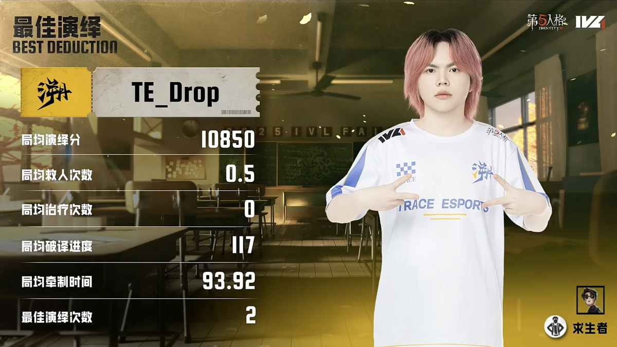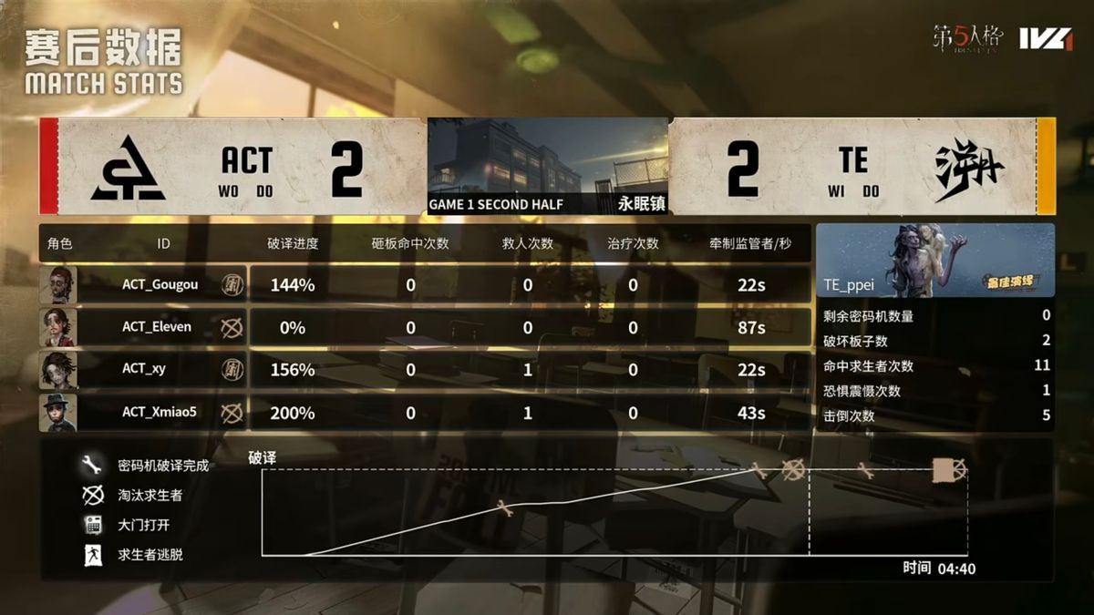 ACT的求生者选择了火灾调查员、病患、空军、佣兵(BAN“跛脚羊”);TE的监管者ppei选择了歌剧演员。(BAN先知、古董商、气象学家、入殓师)